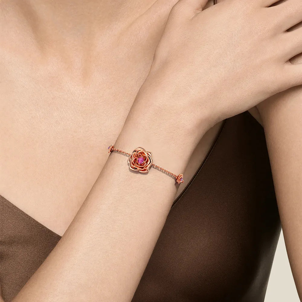 From our breast cancer awareness collection, the “Radiant Hope” bracelet is a graceful blend of beauty and significance. Crafted in rose gold, it features a central rose design with a pink gem, along with smaller rose and pink gem accents along the chain. The rose and pink hues symbolize compassion, hope, and solidarity, making this bracelet not just an elegant accessory, but a heartfelt way to show support for breast cancer awareness. Perfect for adorning your wrist, it adds a touch of meaningful charm to any ensemble, whether for daily wear or special moments.