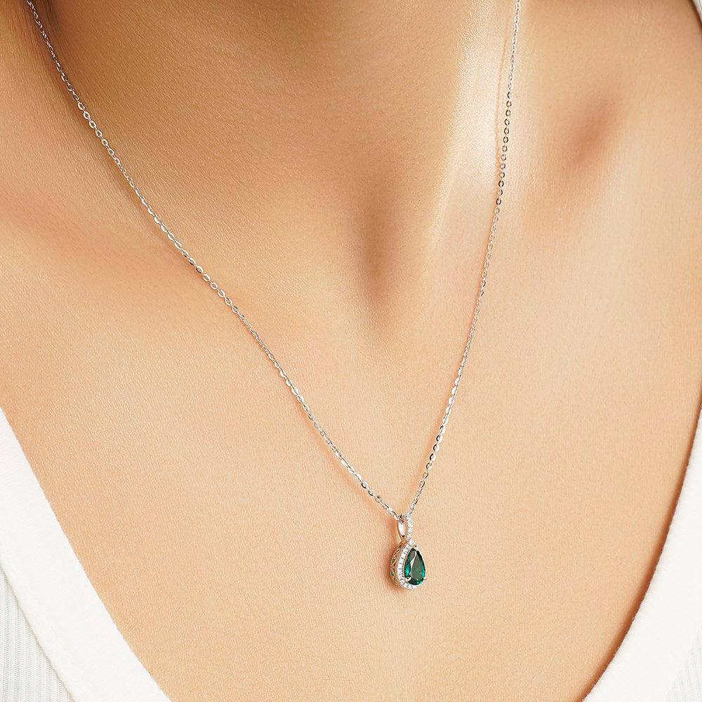 Striking and brilliant, this pear-shaped pendant showcases a vibrant emerald accented by a micropavé diamonds halo with a matching cable chain necklace.