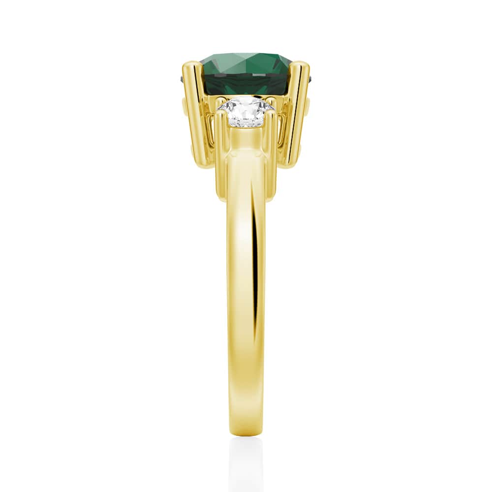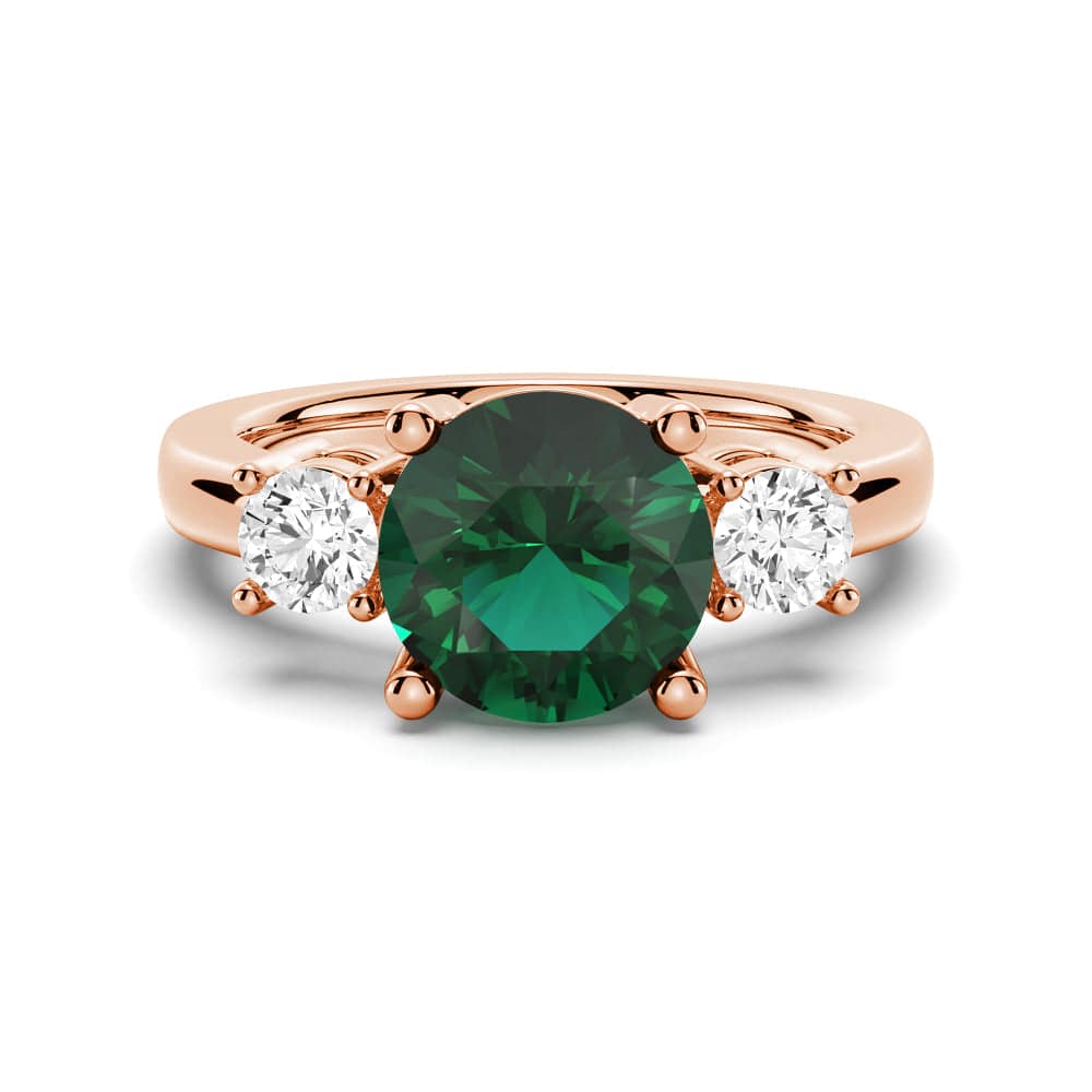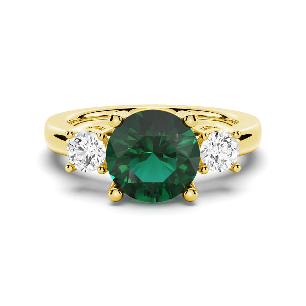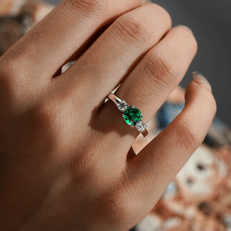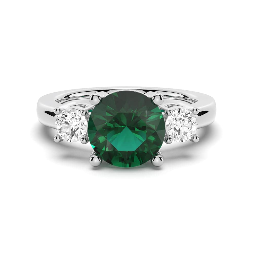 Graceful in design, this emerald and white sapphire ring features a green round-cut emerald and is perfectly accented by two round brilliant white sapphires for a stunning three-stone ring.