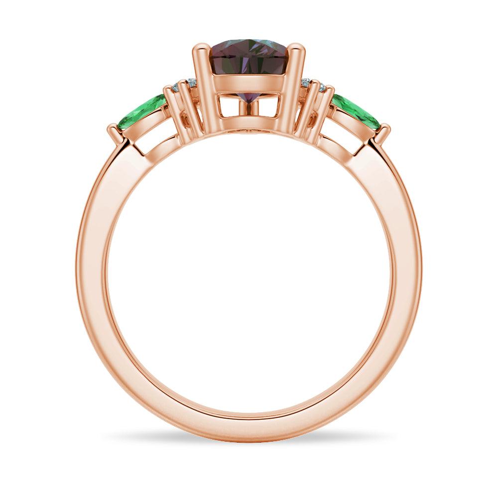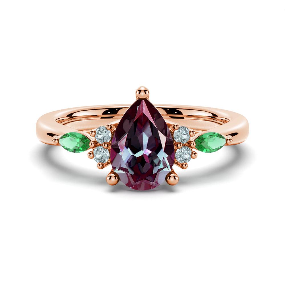 An appealing color-change alexandrite is secured in a prong setting and flanked by 2 marquise emeralds and four round alexandrites clusters. Designed in rose gold, this pear-shaped alexandrite engagement ring has a sophisticated appeal. This exquisite piece is available insolid S925 Silver/10K Gold/14k Gold.