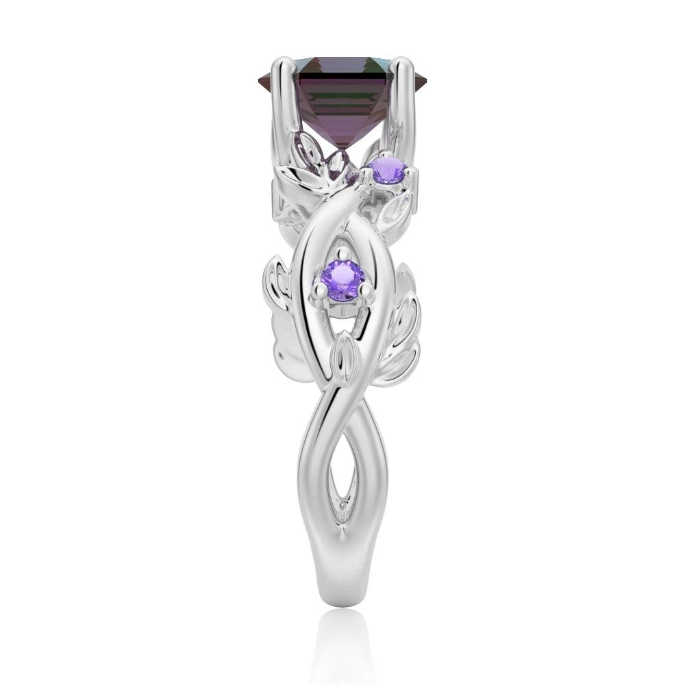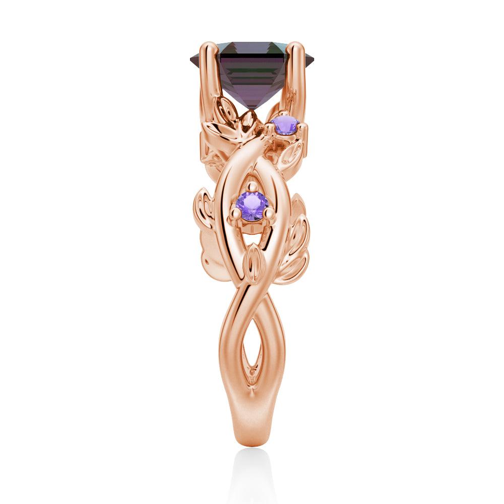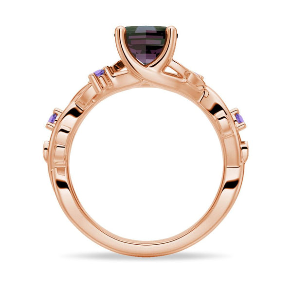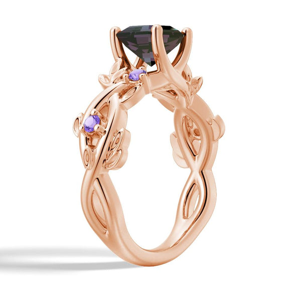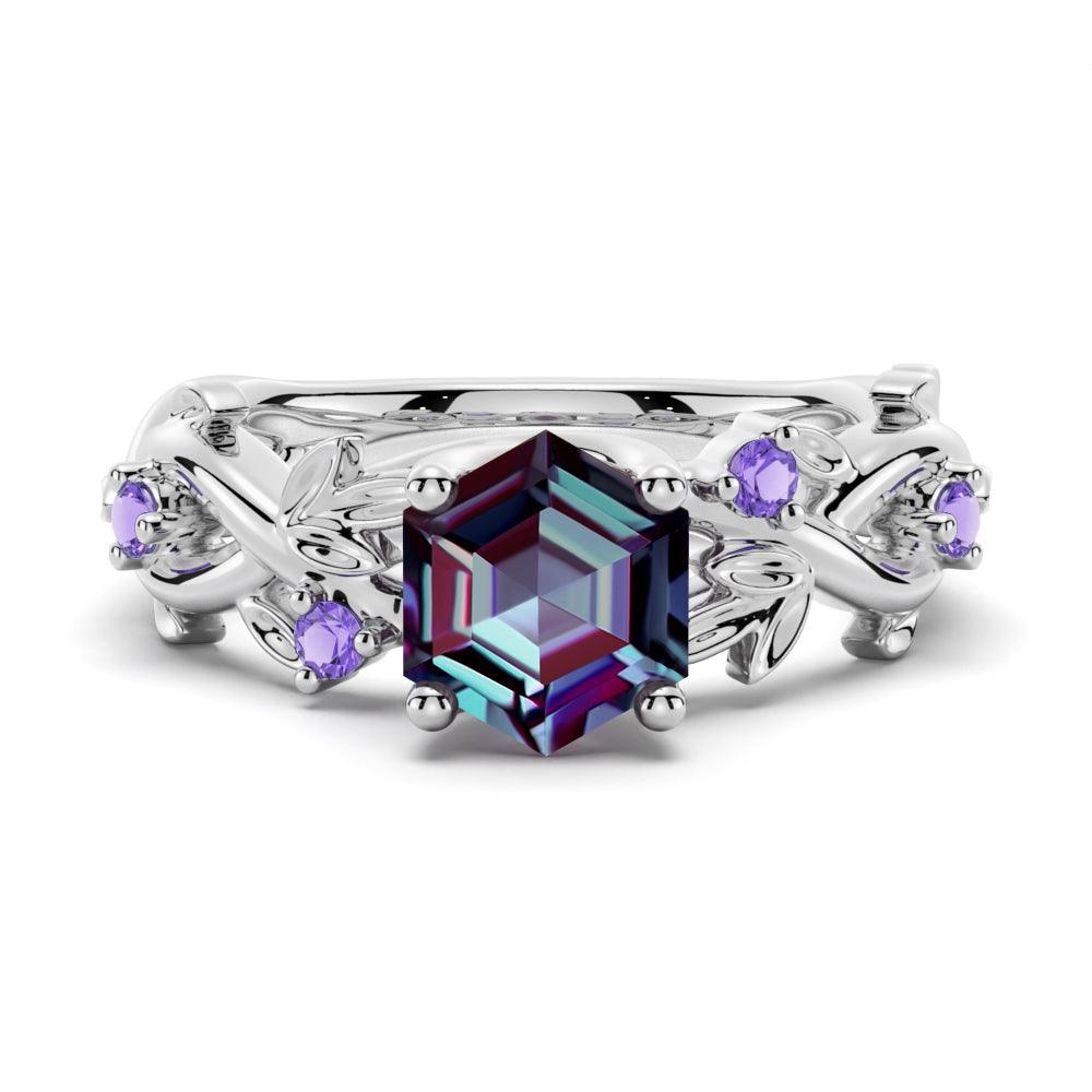 Drawing inspiration from the vintage style, this ring holds at its heart a mysterious hexagon cut alexandrite with its play of colors. Amethyst studded the flower and adorns the lustrous leaf-shaped shoulders of this white gold/rose gold vintage alexandrite ring. This ring is available insolid S925 Silver/10K Gold/14k Gold/Platinum.