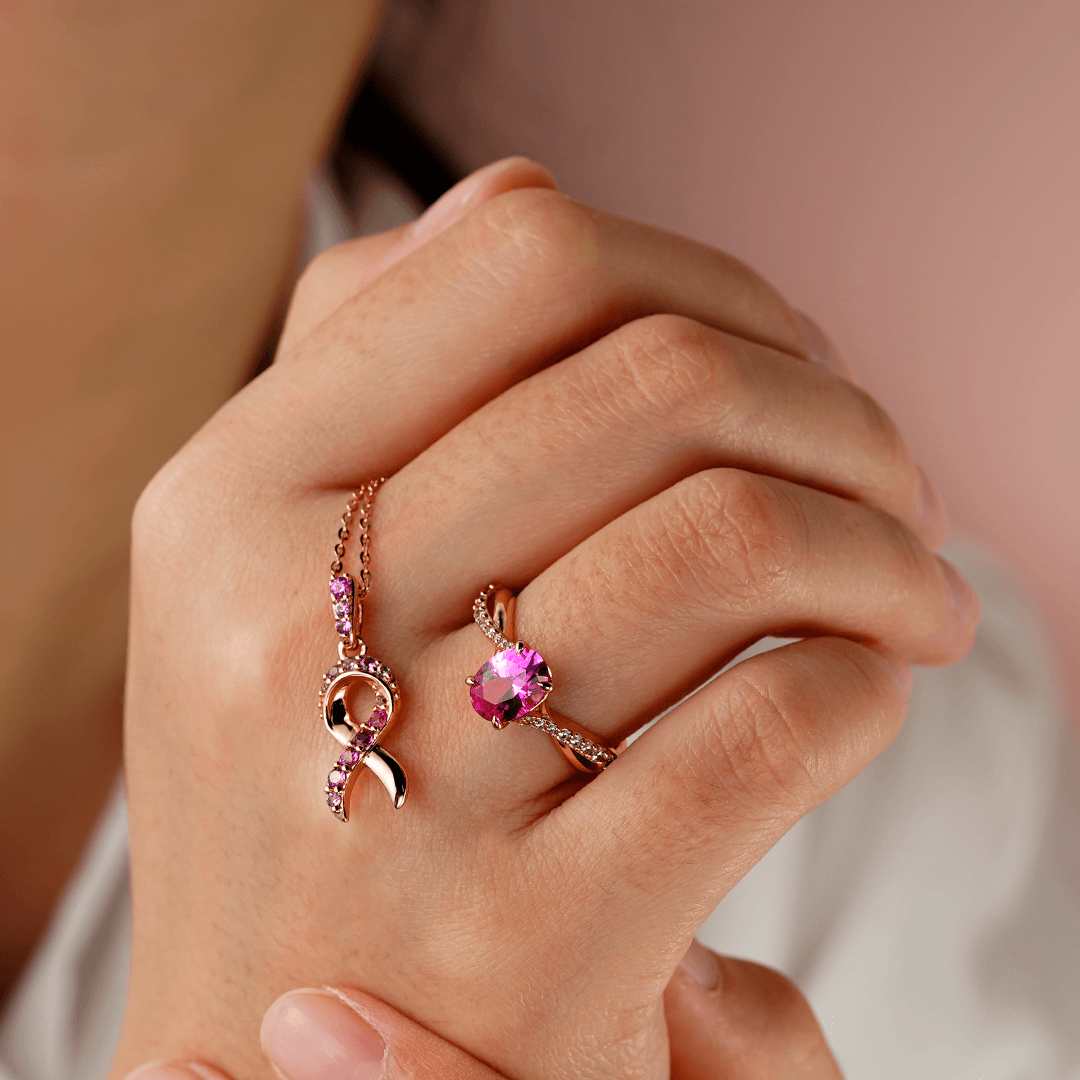In honor of Breast Cancer Awareness Month, MSBLUE will donate 100% profit for every power of jewelry purchased in the BLUE FOR PINK collection to Breast Cancer Awareness organizations. The collection is created solely to support Breast Cancer efforts, and includes beautiful necklaces, ring and earrings all featuring pink sapphires and blue sapphires with breast cancer ribbon designs.