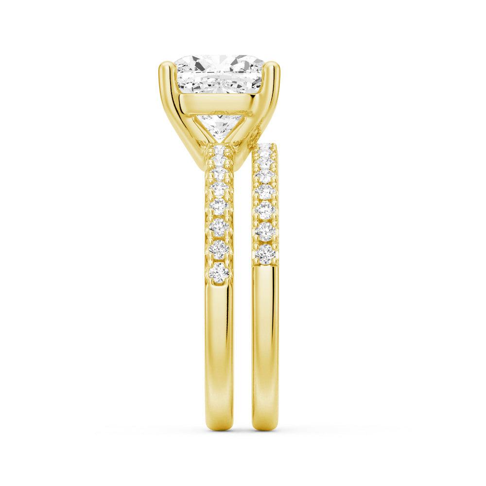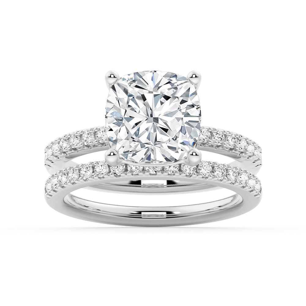 Honor the woman you adore with this classic diamond bridal set. CRafted in sterling silver, the engagement ring features a cushion-shaped moissanite diamond, set in a side-set stone four-pronged frame.