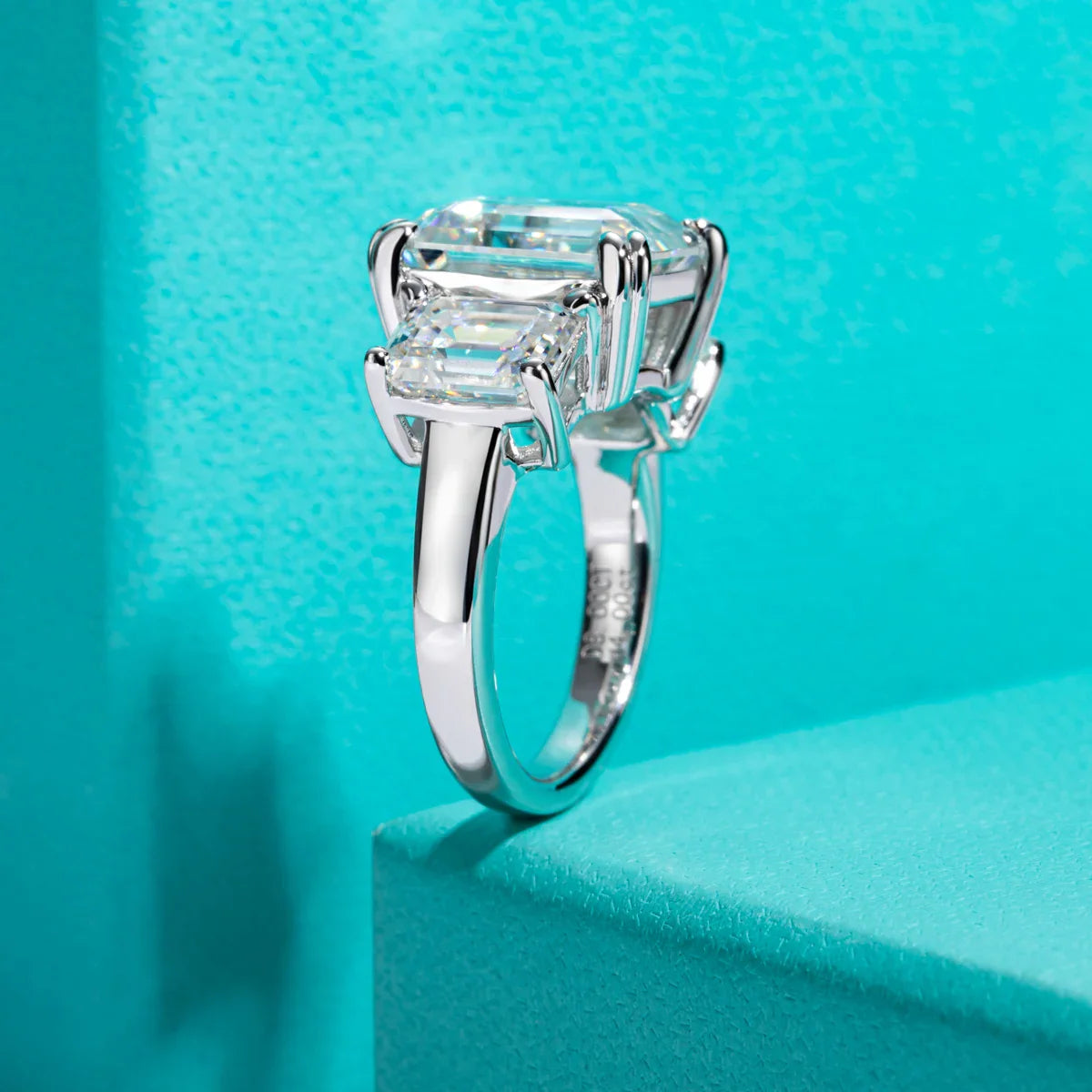 12 CTTW 3 Stone Emerald Cut Moissanite Engagement Ring