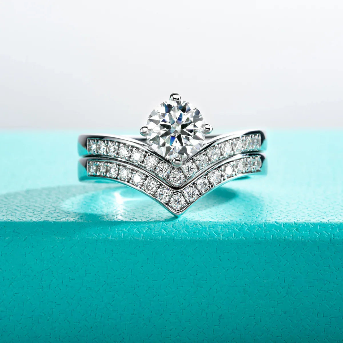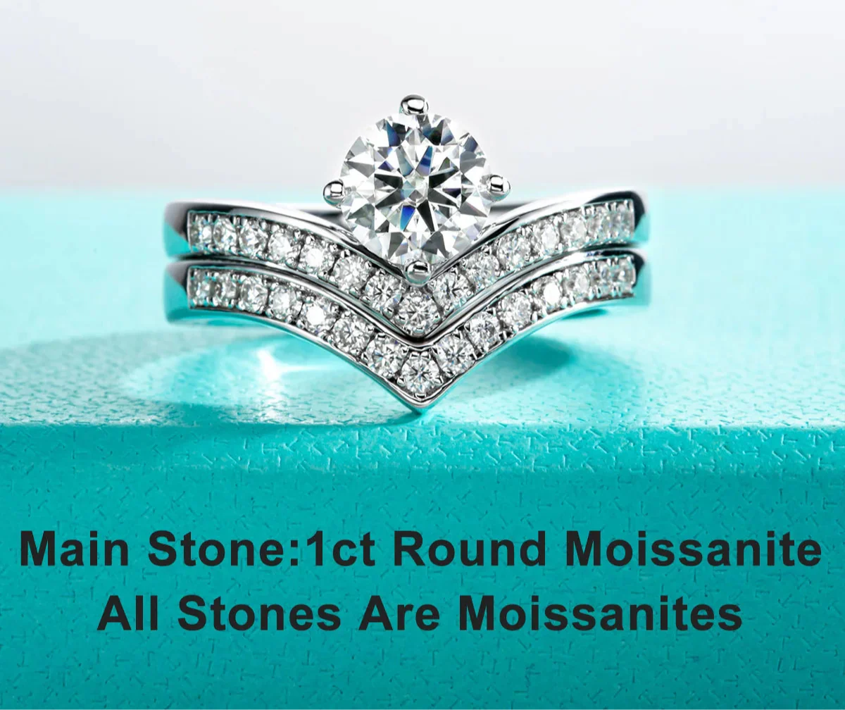 At the heart of this set is a 1 carat round-cut moissanite, chosen for its brilliant sparkle and ideal symmetry. Paired with a complementary moissanite-accented wedding band, this bridal set forms a unified expression of love, commitment, and enduring beauty.