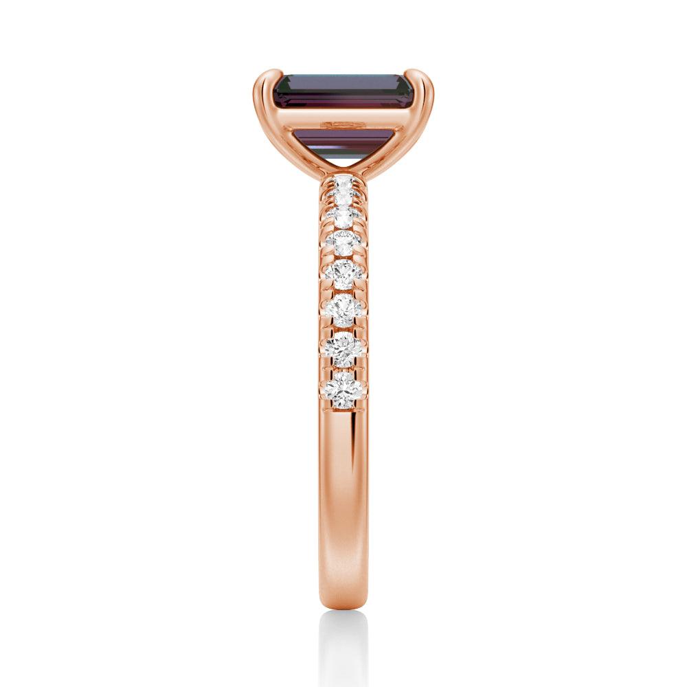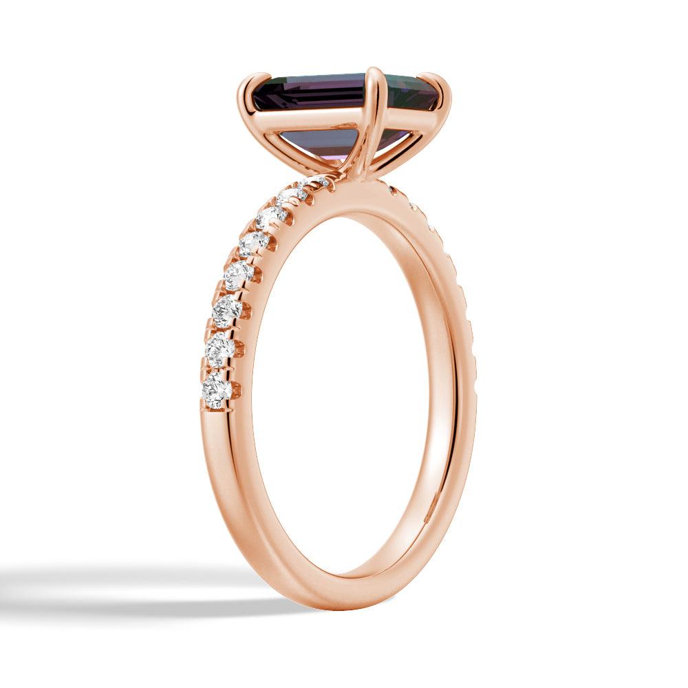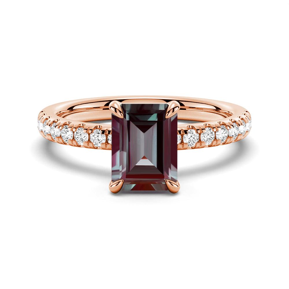 Unique and exquisite, this ring captivates with its splendid emerald-cut alexandrite stone. The bold color-changing gem is claw-set on a classic shank and moissanite diamonds cascade down the shoulders, giving a sparkling look to this alexandrite ring inwhite gold and rose gold. Available insolid S925 Silver/10K Gold/14k Gold/Platinum, this ring is the perfect symbol of your everlasting love.