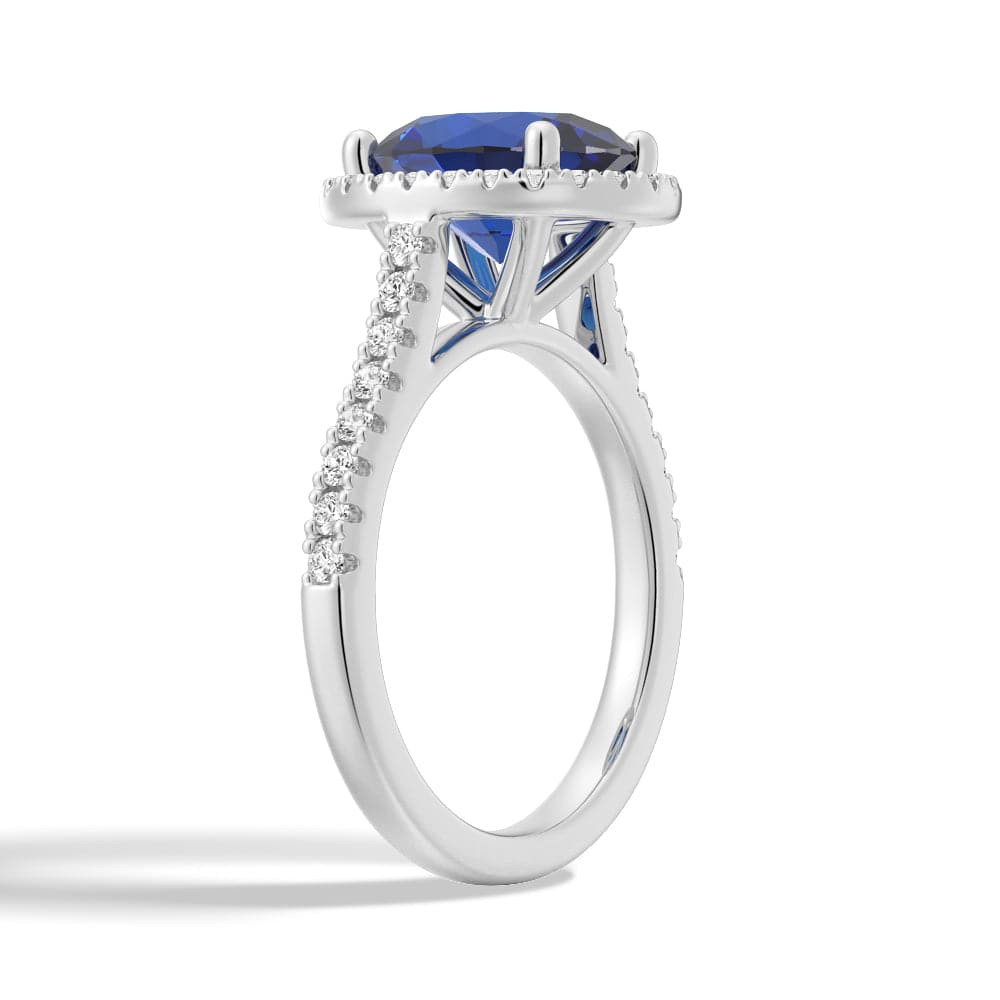 You don't need a special occasion to present her with this extravagantly beautiful ring. Fashioned in 925 sterling silver, the eye is drawn to the 7.0 x 9.0mm oval-shaped blue sapphire center stone. Stunning and shining in a four-prong setting, this gemstone is surrounded by a border of glistening white sapphires, which also line the ring's shank.
