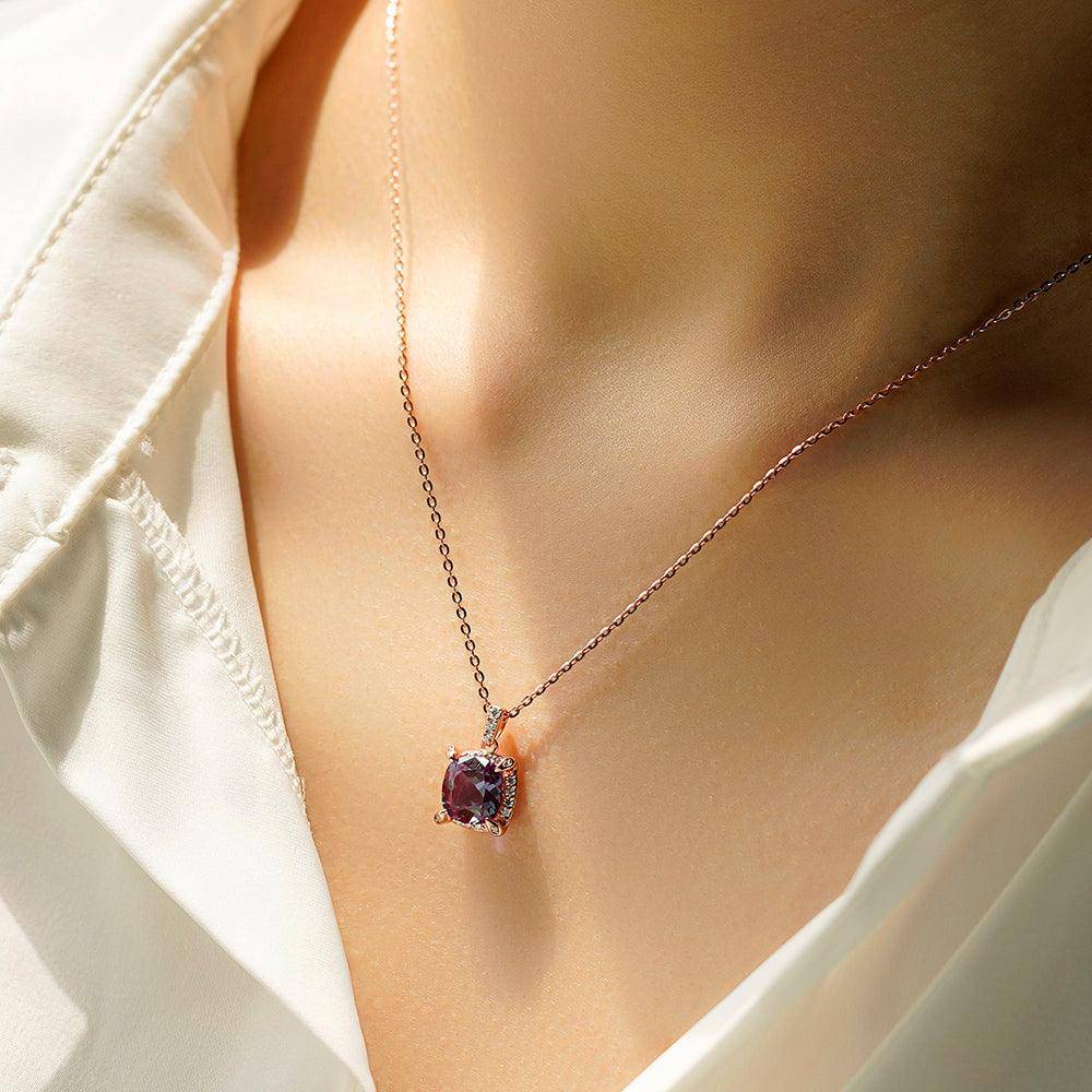 This alexandrite pendant is a stunning and elegant piece of jewelry that is perfect for any occasion. Crafted from high-quality materials, the pendant features a cushion-cut Alexandrite gemstone that changes color depending on the lighting and angle, creating a unique and eye-catching effect. The gemstone is surrounded by a pave setting of sparkling moissanite stones, adding to the pendant's brilliance and sophistication. The pendant is versatile and can be worn with a variety of outfits, making it a great addition to any jewelry collection. Whether you're looking for a special gift for a loved one or a treat for yourself, the 3 CT. Cushion Cut Alexandrite Moissanite Pave Pendant is sure to make a statement and turn heads.