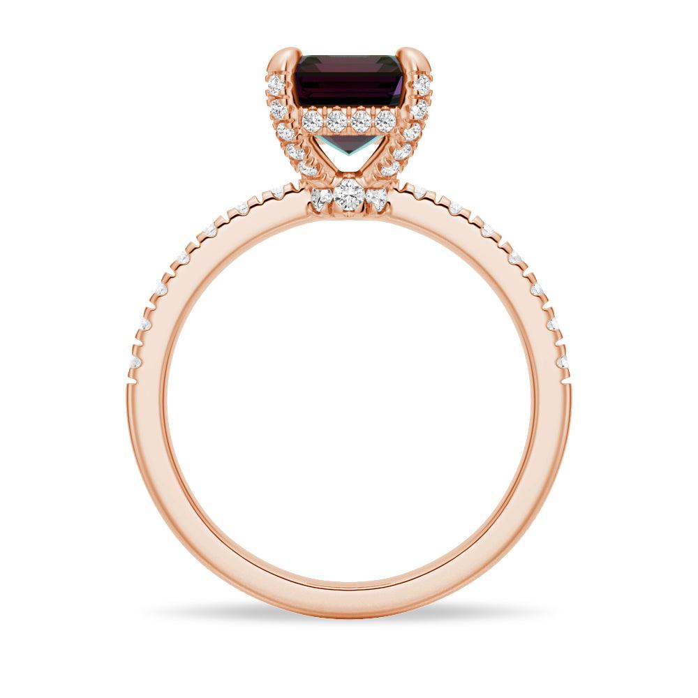 Unique and exquisite, this ring captivates with its splendid emerald-cut alexandrite stone. The bold color-changing gem is claw-set on a classic shank and moissanite diamonds cascade down the shoulders, giving a sparkling look to this alexandrite ring in rose gold.The ring is available insolid S925 Silver, 10K Gold, and 14K Gold, and is sure to make a statement with its bold and unique design.
