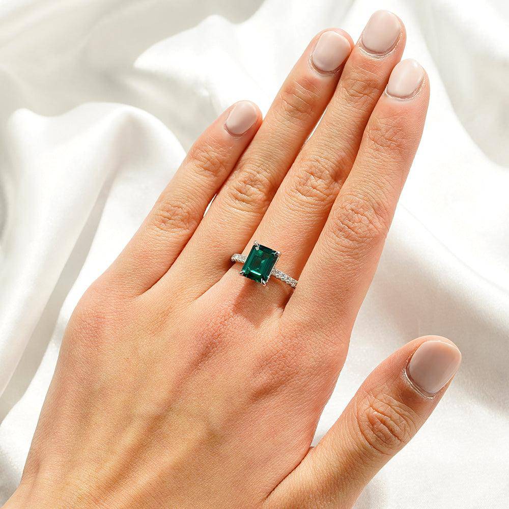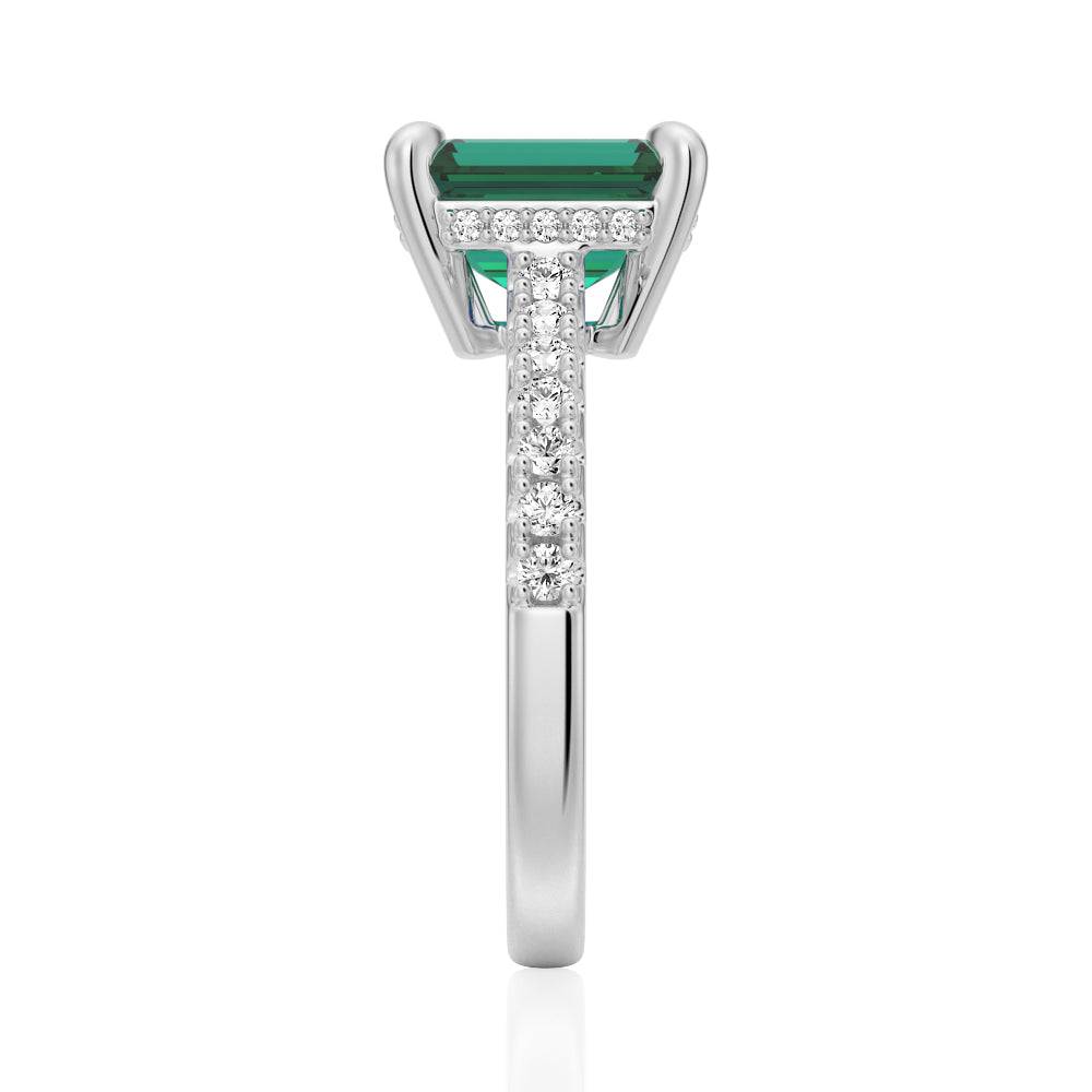 Crafted with meticulous precision, this engagement ring showcases a side stone design, where shimmering lab-grown emeralds gracefully adorn the band. The lab-grown emeralds, with their captivating green hue, symbolize love and eternal youth, making this ring a perfect representation of your lasting commitment.
