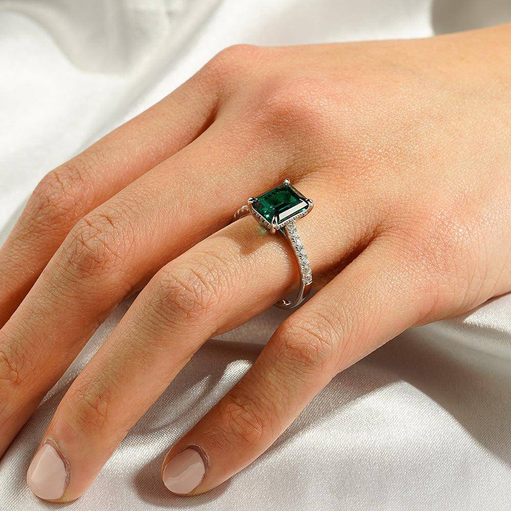 Whether you're proposing or looking to celebrate a special milestone, this exceptional engagement ring is designed to leave a lasting impression. Embrace the allure of lab-grown emeralds and bask in the elegance of the 3 CT. Side Stone Lab Grown Emerald Engagement Ring with Hidden Halo—a true symbol of your love and devotion.