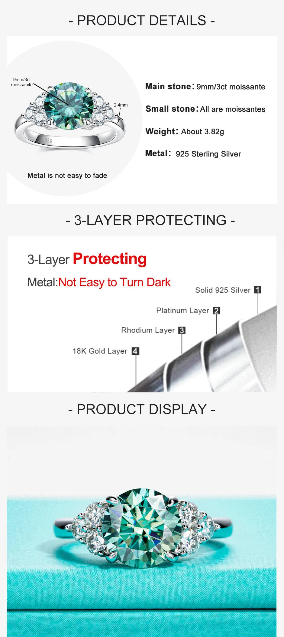 - Premium Moissanite: 3ct round-cut blue-green moissanite for unique brilliance.