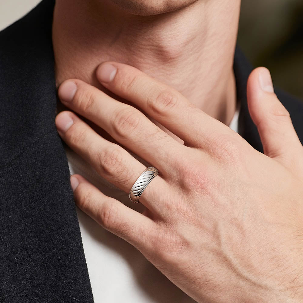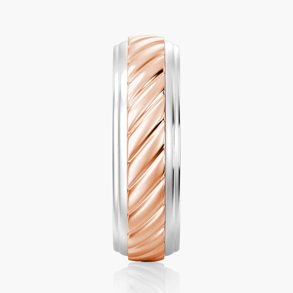The 7mm width of this band offers a bold and substantial presence, ideal for men who appreciate a statement piece. The two-tone design is a testament to the fusion of classic and contemporary styles. Crafted with meticulous care, the band features a striking combination of metals, creating a visually captivating contrast.