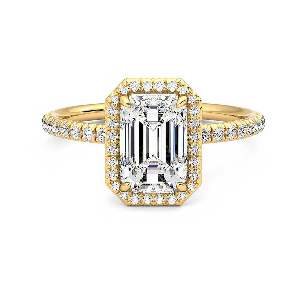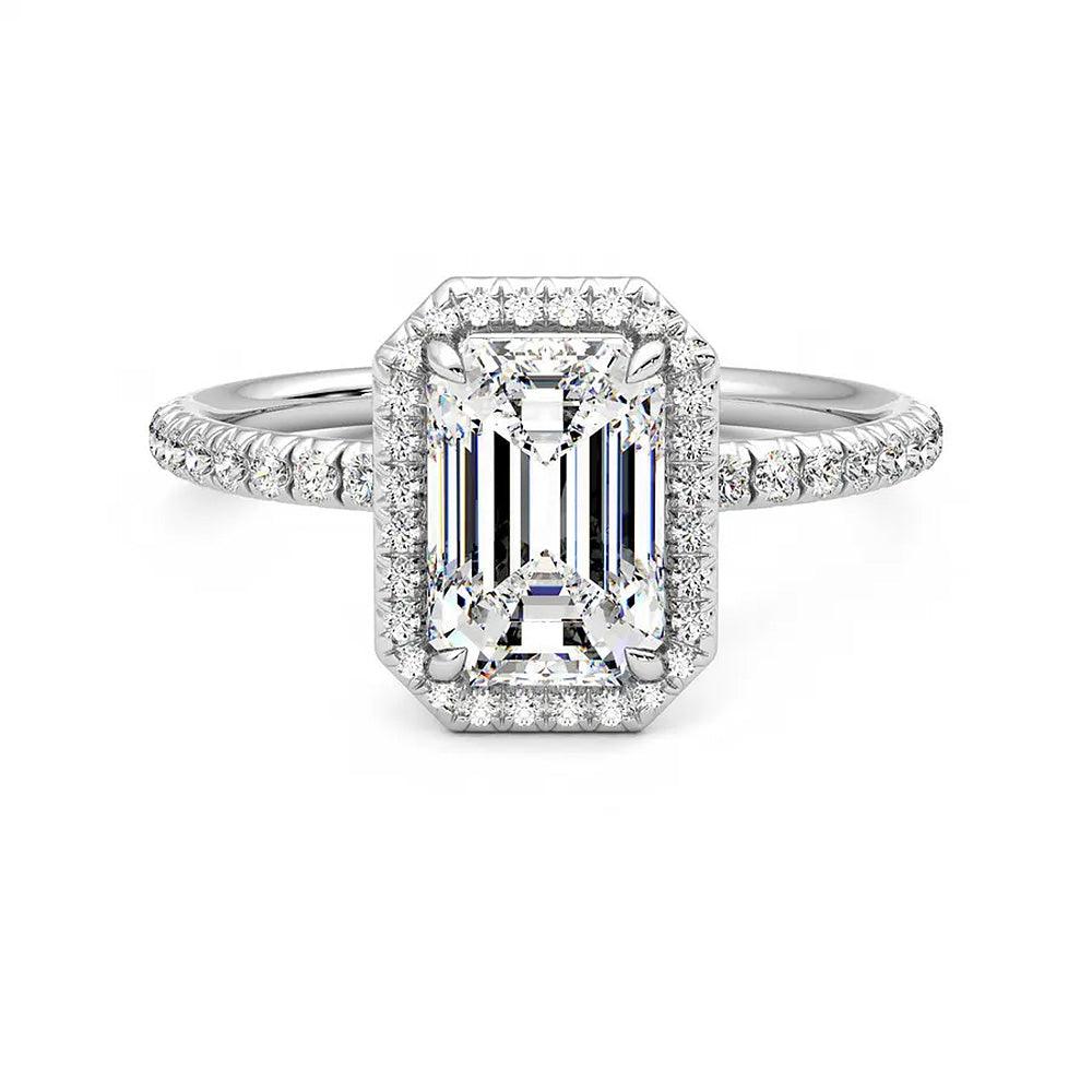 The centerpiece features a stunning emerald cut moissanite, celebrated for its sophisticated geometry and captivating sparkle. Encircling the central stone is a classic halo of shimmering gemstones, designed to enhance the moissanite’s brilliance and add an extra layer of glamour.