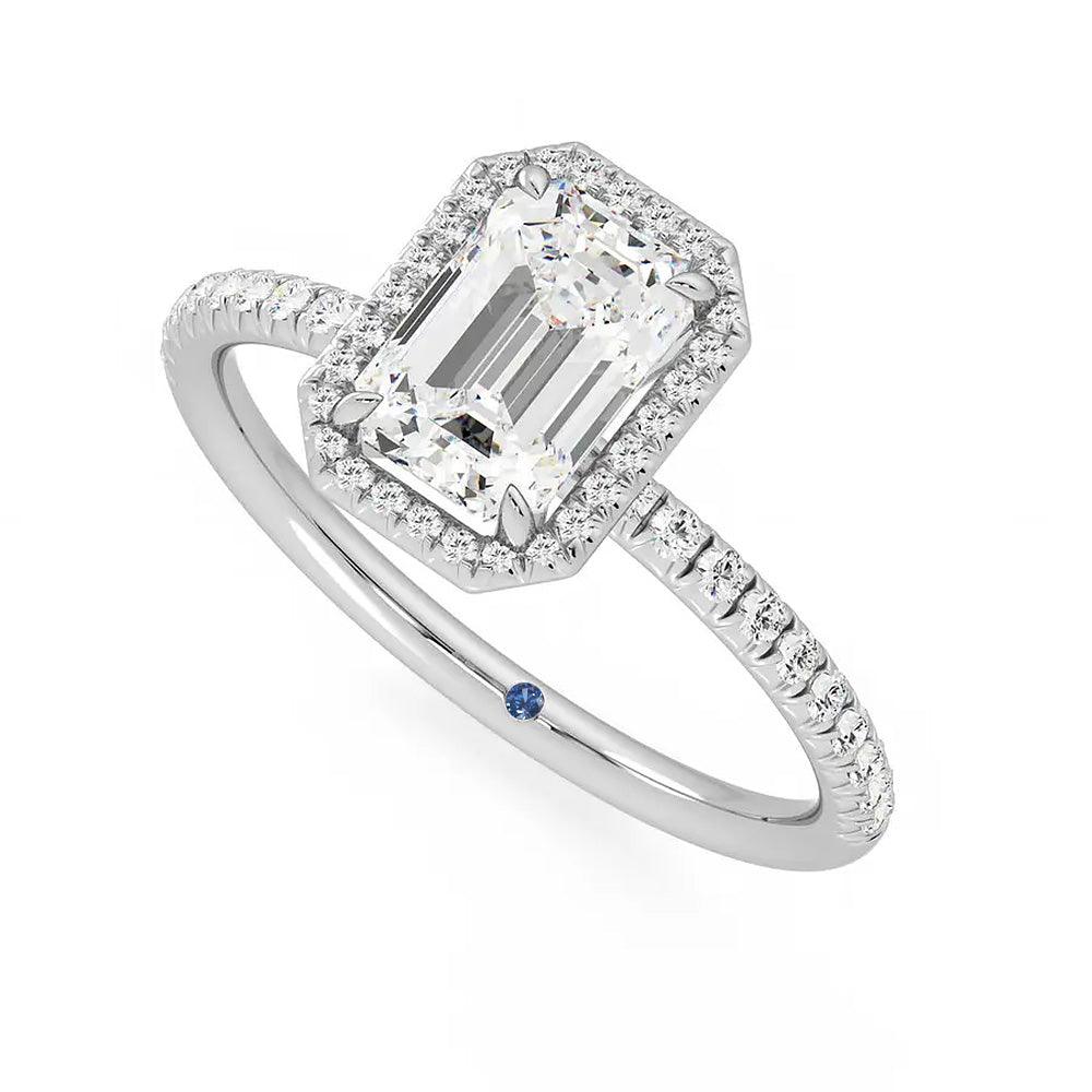 Classic Halo Emerald Cut Moissanite Engagement Ring with Hidden Anniversary Stone Accent