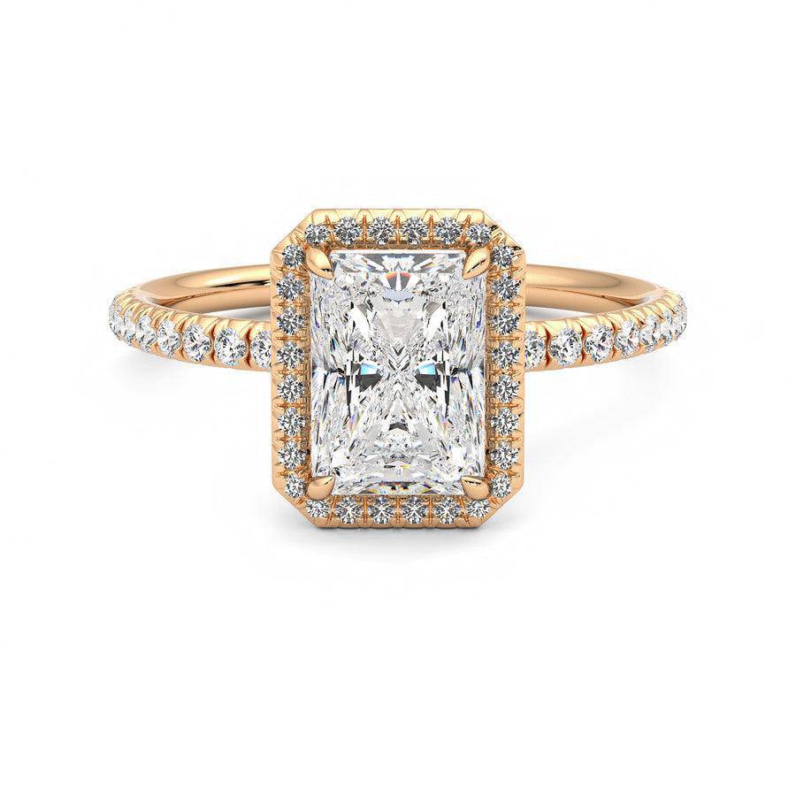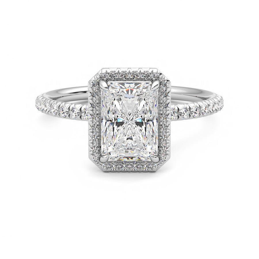 The centerpiece features a stunning radiant cut moissanite, celebrated for its sophisticated geometry and captivating sparkle. Encircling the central stone is a classic halo of shimmering gemstones, designed to enhance the moissanite’s brilliance and add an extra layer of glamour.
