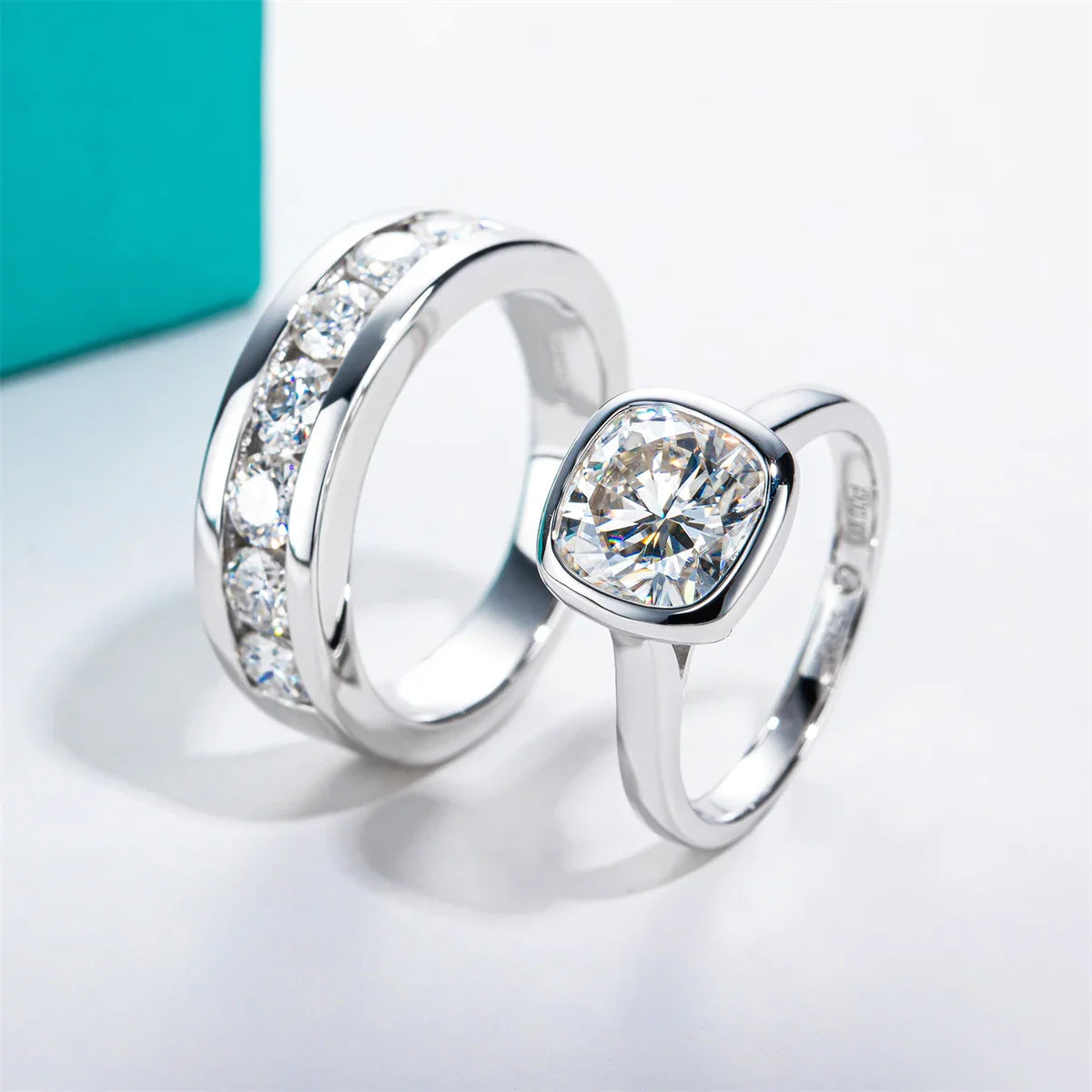 Express your eternal love with the Zeevera.com D Color Moissanite Couple Rings. This exquisite set includes matching wedding bands, adorned with sparkling D Color Moissanites, set in 925 sterling silver. Perfect for engagements and weddings.