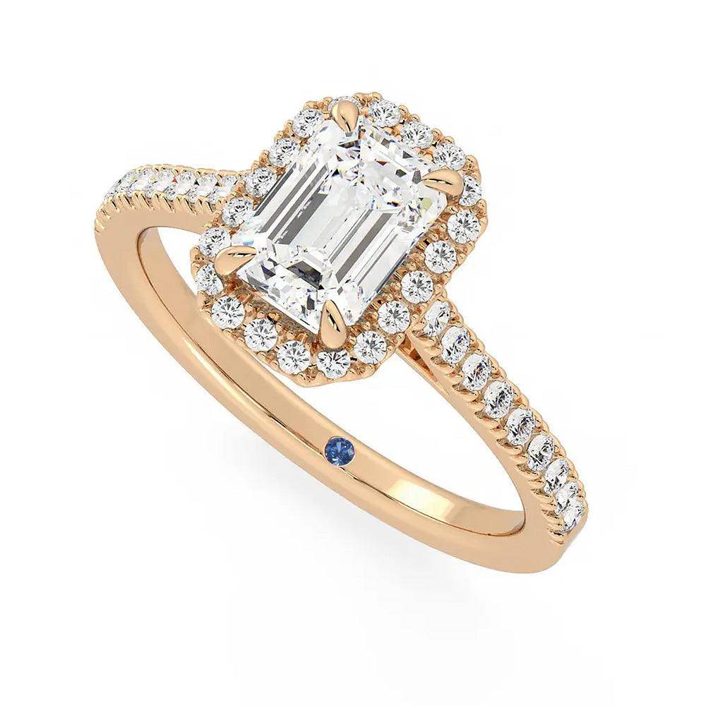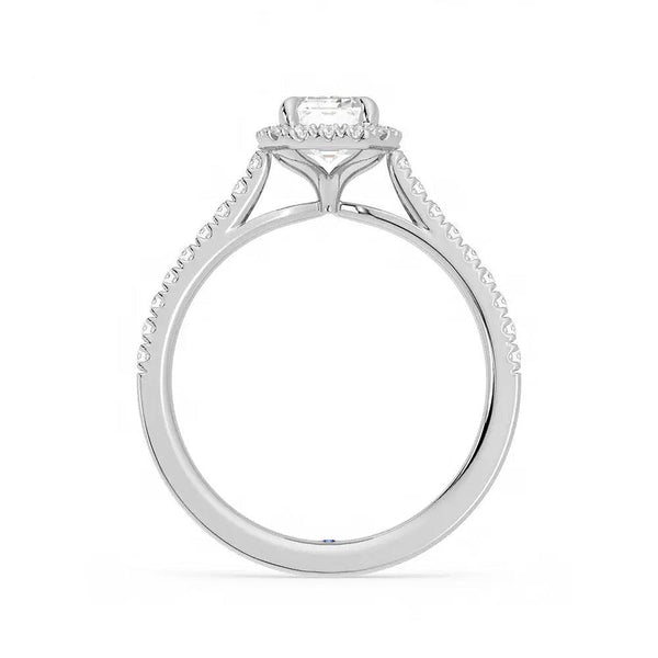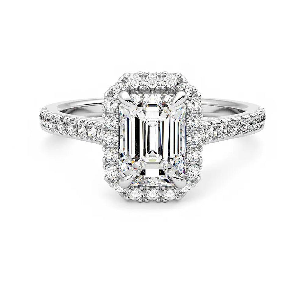 The centerpiece features a stunning emerald cut moissanite, renowned for its sleek lines and elegant sparkle. It is encircled by a halo of shimmering gemstones, enhancing the central stone’s brilliance and adding an extra touch of glamour.
