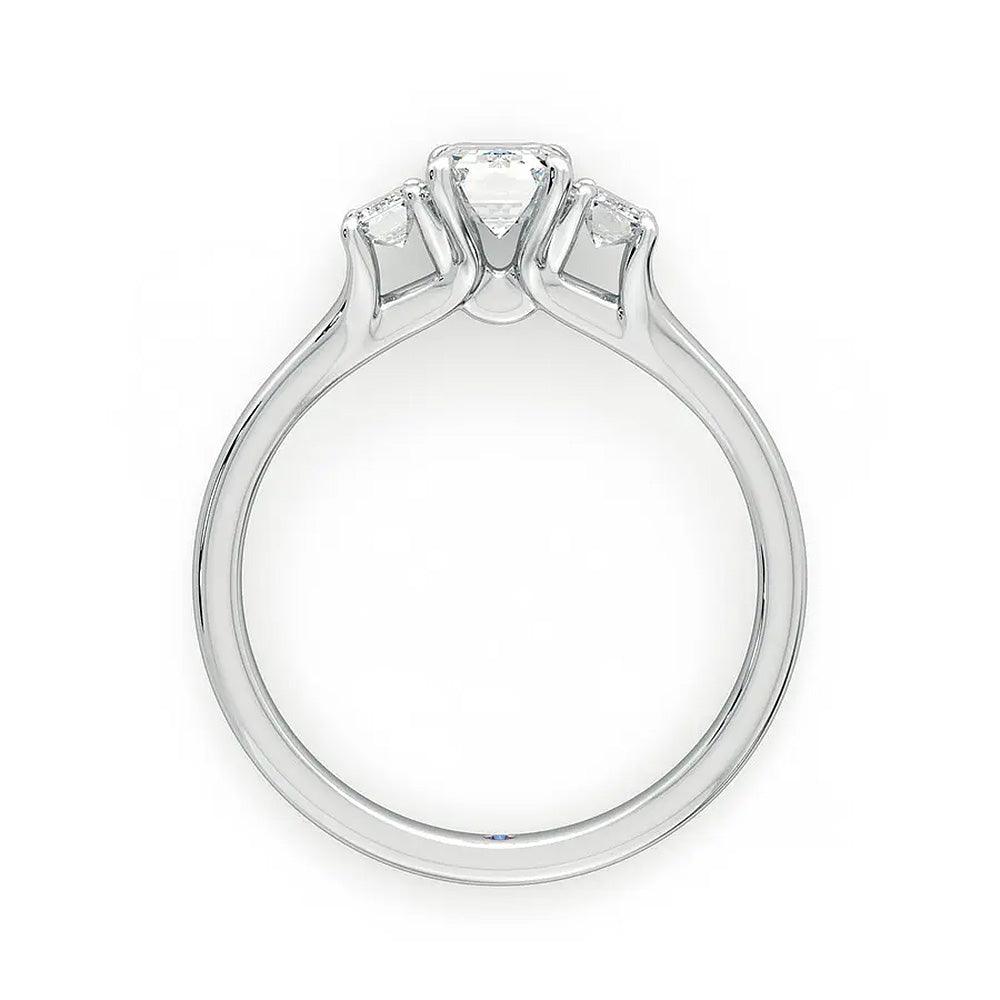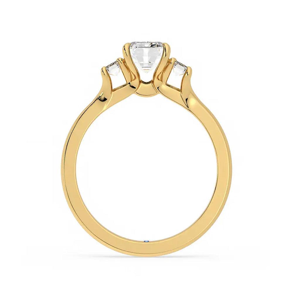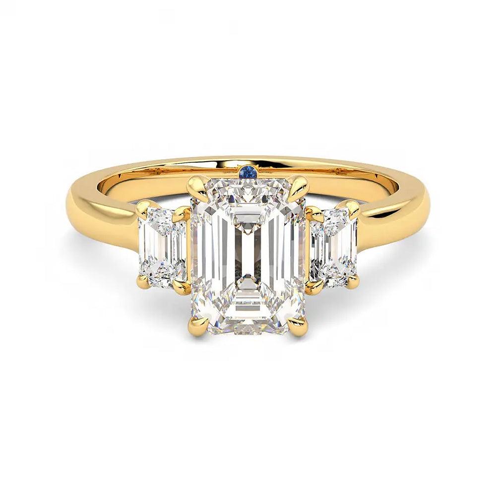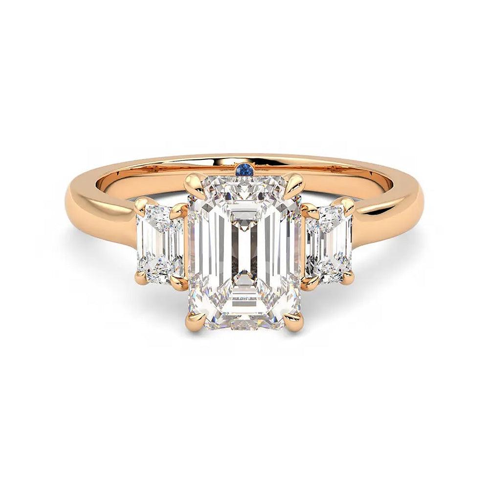At its heart is a breathtaking emerald cut moissanite, held securely by a classic four-prong setting that highlights its elegant lines and exceptional sparkle. Flanking the central stone are two additional emerald cut moissanites, creating a harmonious trio that represents your past, present, and future together.