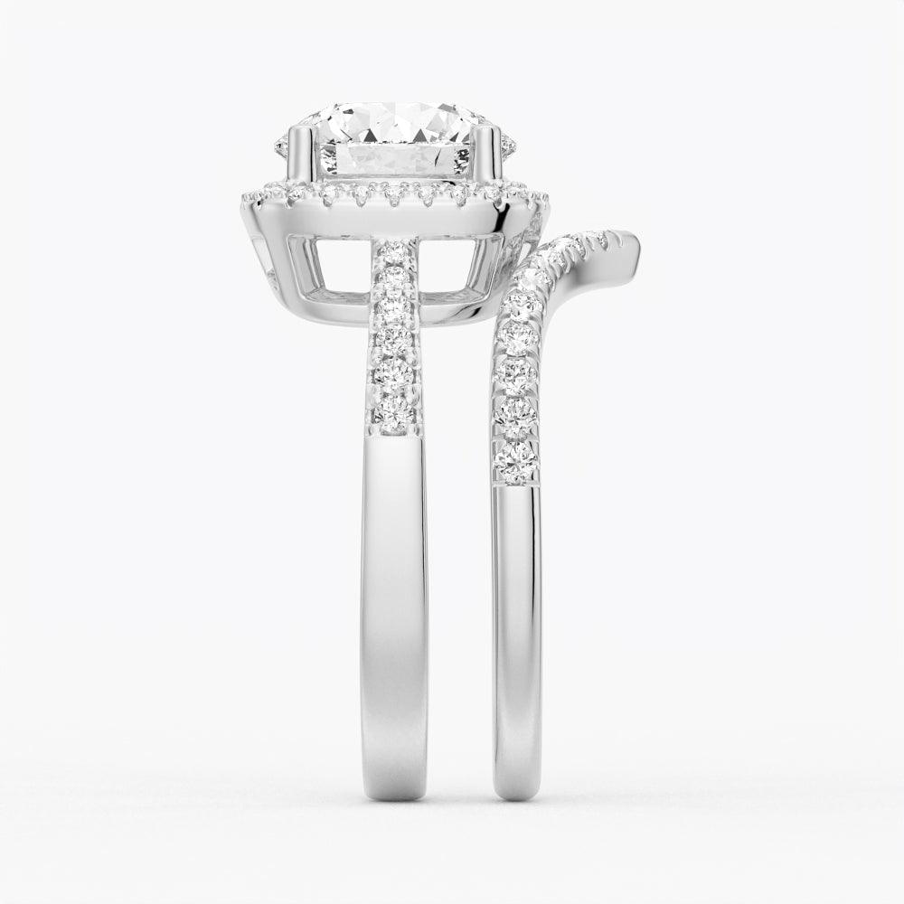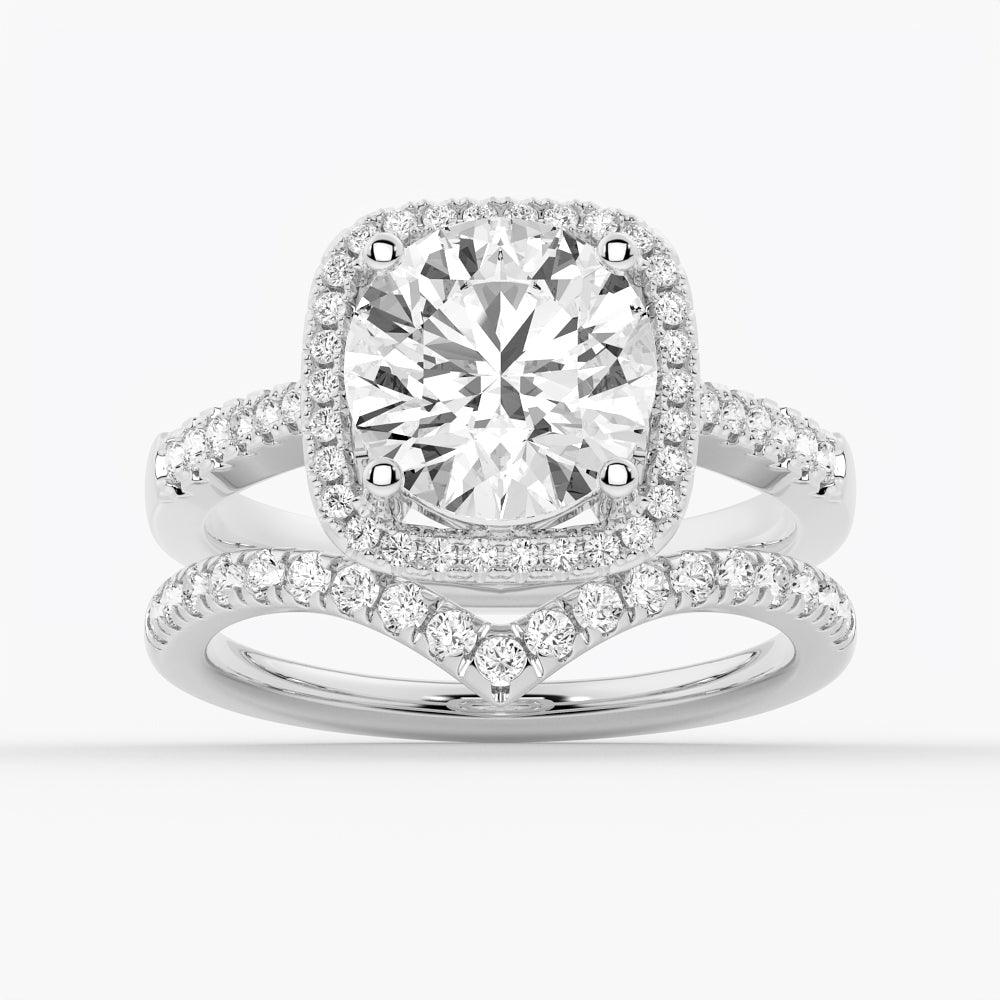 This eye-catching setting features a halo of stunning cushion-shaped diamonds. Within half halo of scalloped pavé diamonds that adorn the band makes this ring truly spectacular.