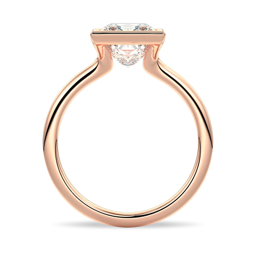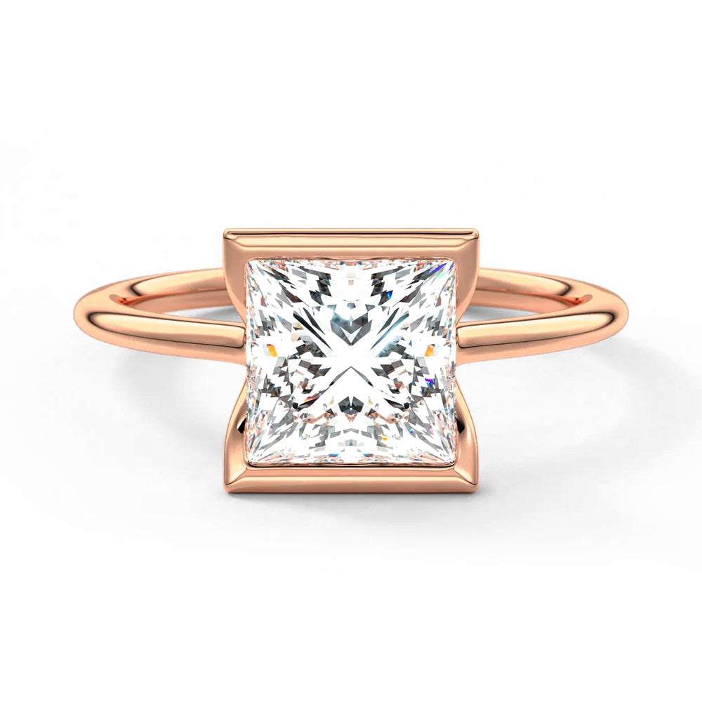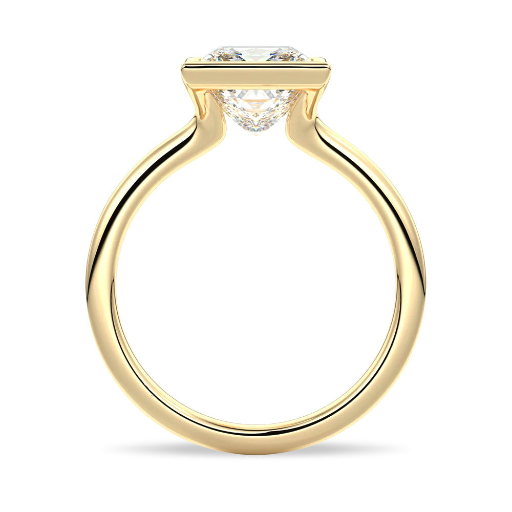 This distinctive ring features a half bezel setting—a clean, contemporary design that embraces the stone on two sides, leaving its corners visible yet protected. The partial frame enhances the linear structure of the princess cut while lending the ring a floating, architectural quality.