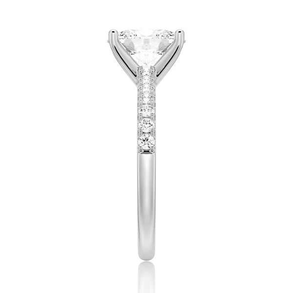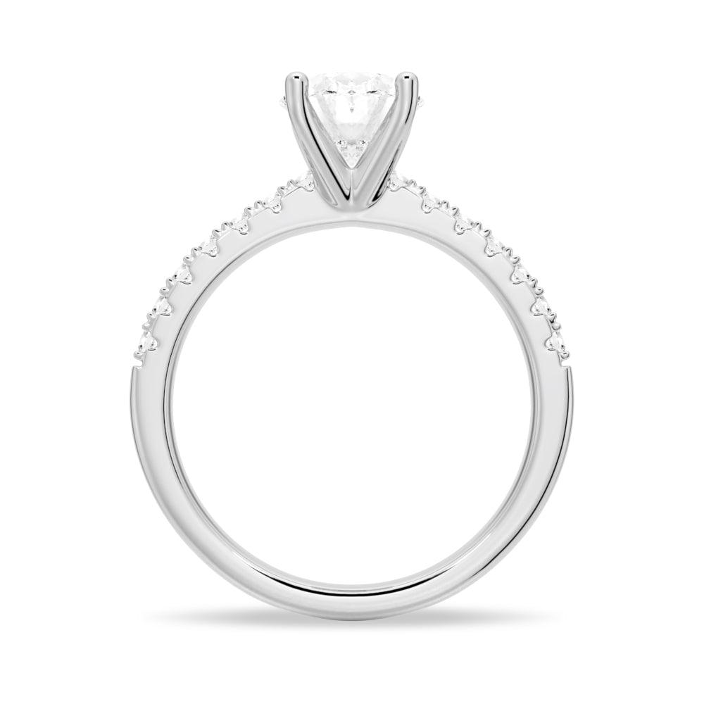 This ring combines the sophistication of the oval-shaped moissanite with the subtle sparkle of petite micropavé detailing. Crafted with precision and attention to detail, the petite micropavé setting along the band adds a touch of brilliance, enhancing the overall charm of the ring. The oval-shaped moissanite, known for its timeless and elongated silhouette, takes center stage, radiating a captivating sparkle.