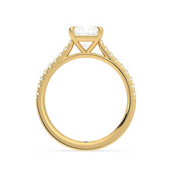 The centerpiece is a striking princess cut moissanite, celebrated for its sharp, modern lines and exceptional sparkle. It is beautifully complemented by pavé accents that cascade down the band, adding a touch of refined brilliance and enhancing the ring’s overall allure.
