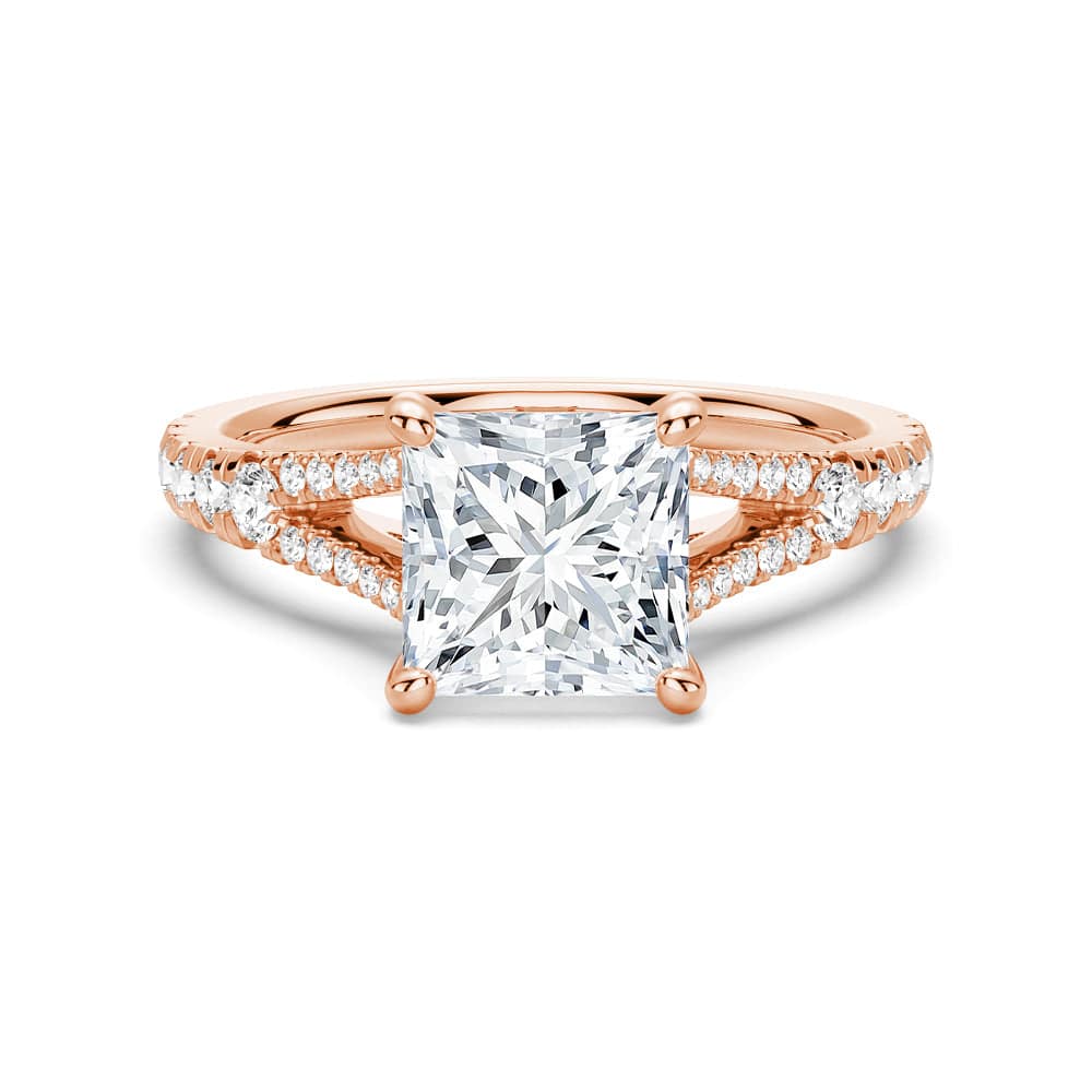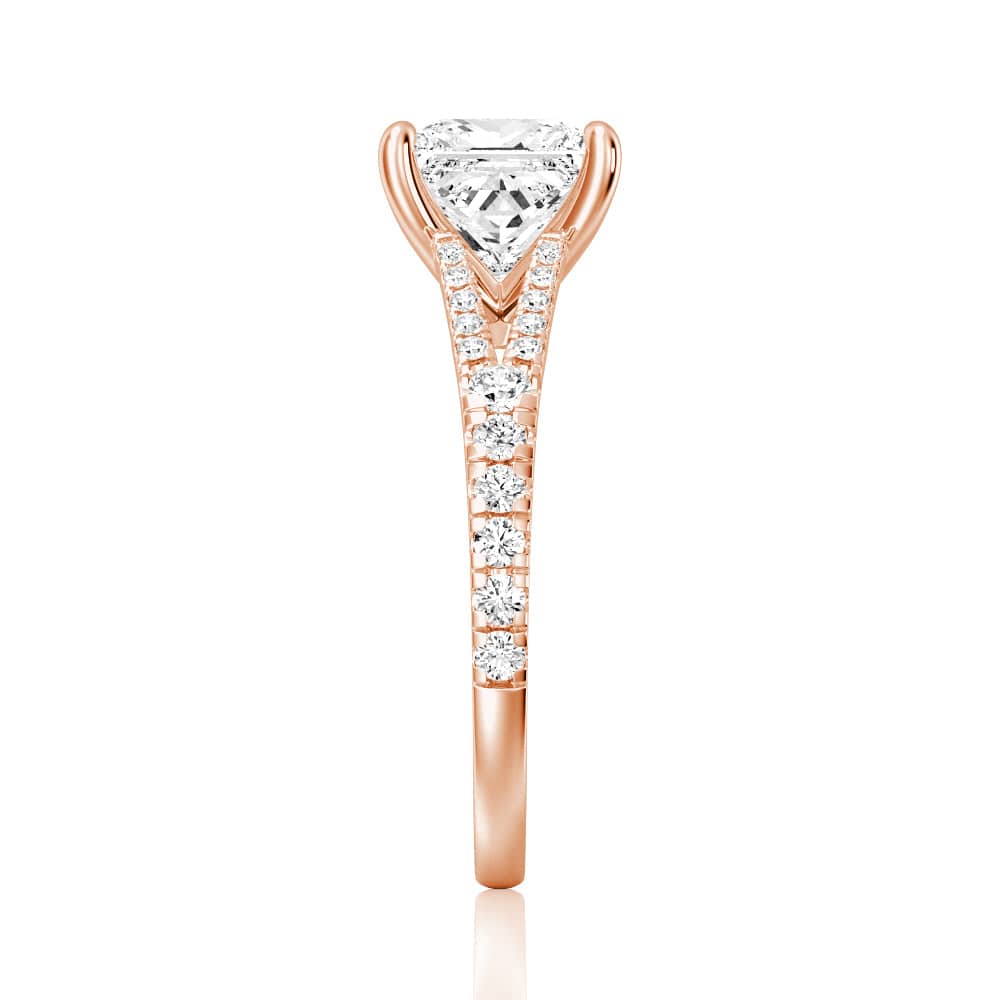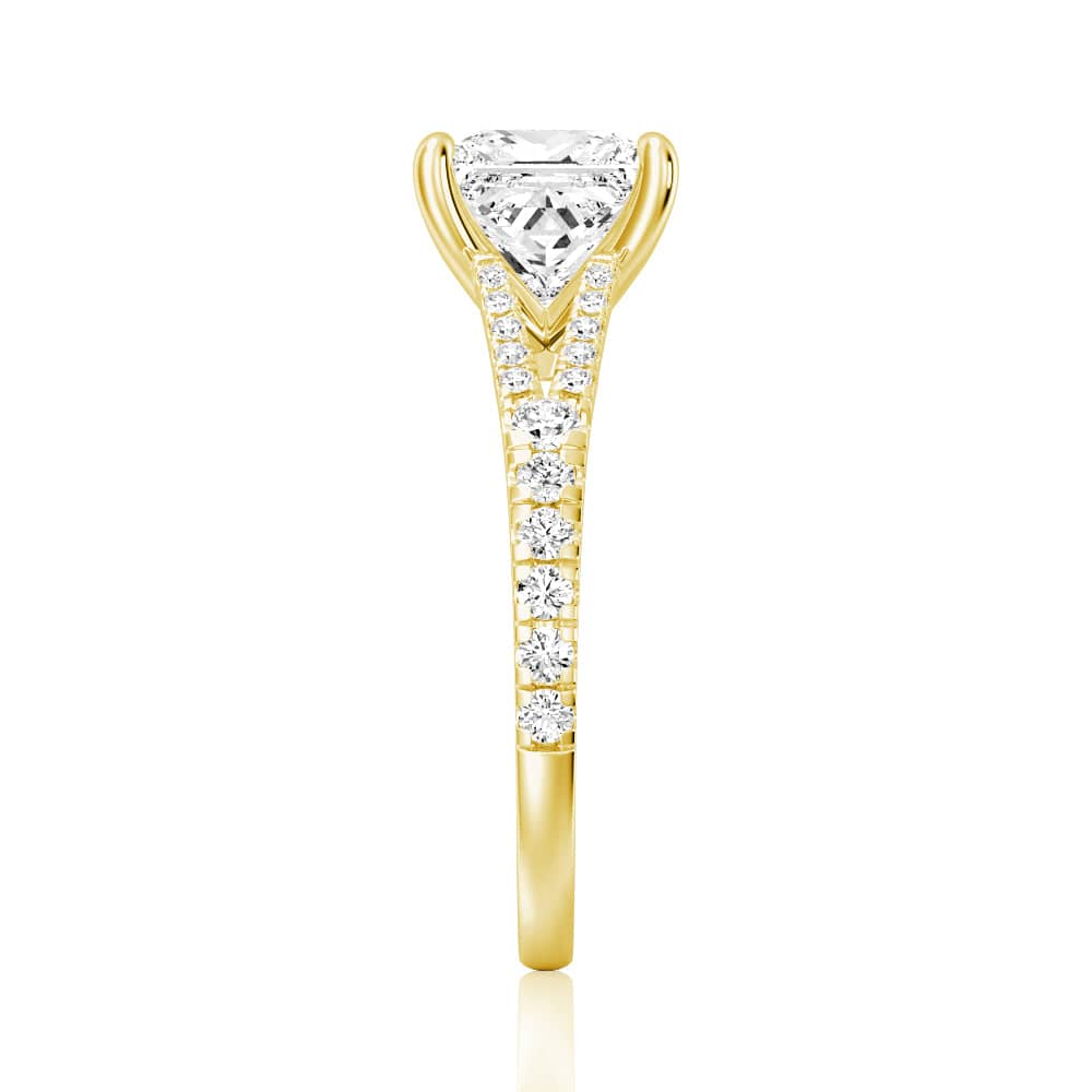 The split-shank design of this ring symbolizes the two paths of your lives coming together as one, making it the perfect choice for a romantic proposal or anniversary gift. The princess cut of the stone adds a touch of regal elegance, making it a perfect choice for the modern bride.