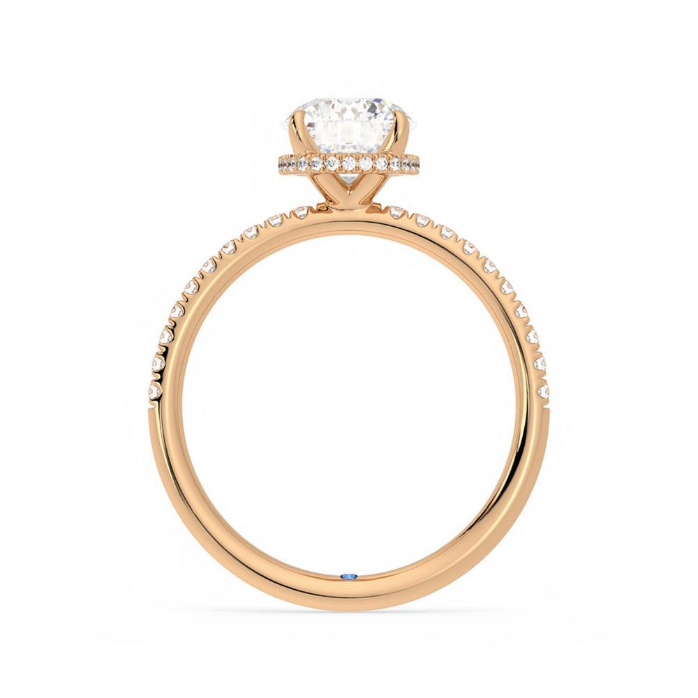 Surrounding the main stone is a hidden halo of delicately set gemstones, subtly enhancing the ring's radiance and adding a touch of surprise visible only upon closer inspection.