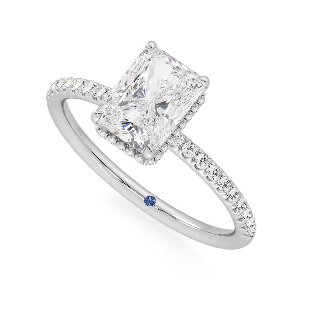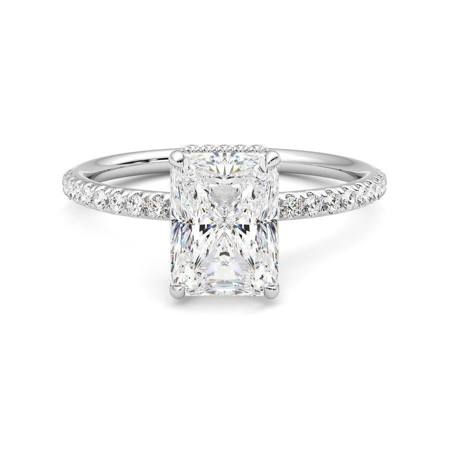 Radiant Cut Moissanite Engagement Ring with Hidden Halo and Anniversary Stone Accent