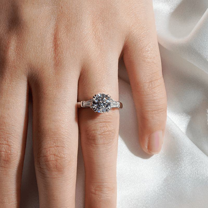 This iconic ring features two tapered baguette-cut side stones, brilliantly framing the center classic round-cut moissanite diamond set in double-claw prongs. This ring offers a petite silhouette with a timeless style. Available from 1 carat to 3 carat. For more carat options pleaseContact our Customer Service:service@msblue.com