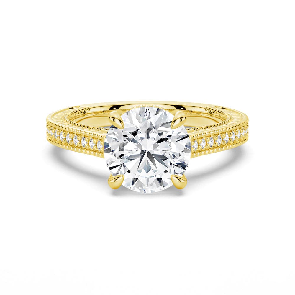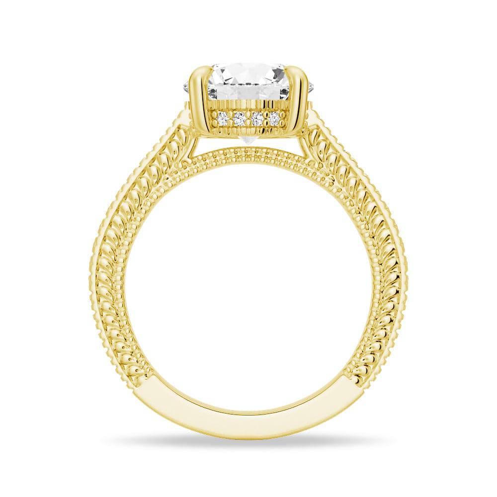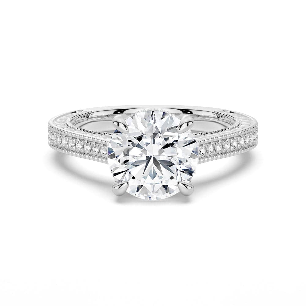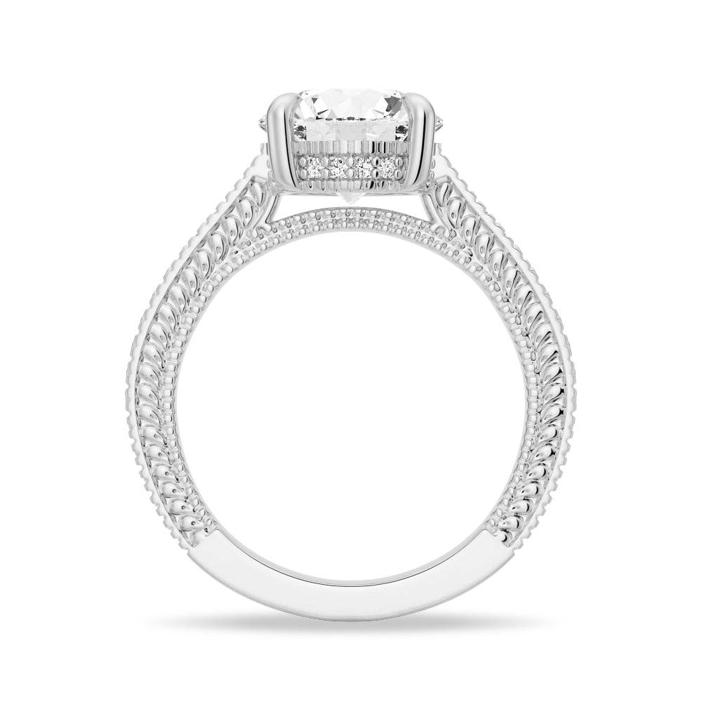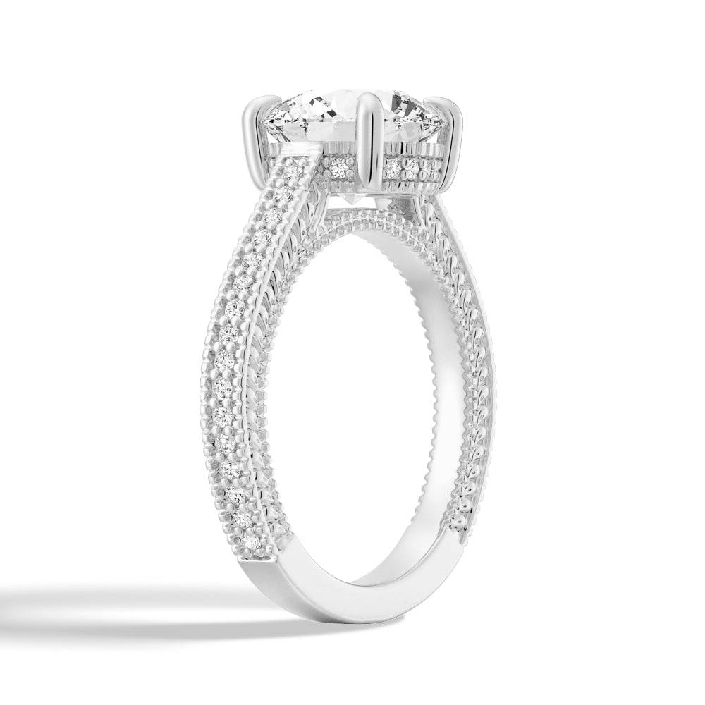 Elevate your proposal—The brilliant round-cut moissanite takes center stage, adorned by a delicate pave setting that enhances its sparkle. The cathedral-style mounting gracefully lifts the stone, symbolizing the ascent of your love. Meticulously crafted with attention to detail, the ring exudes timeless elegance. The seamless fusion of traditional charm and contemporary sophistication makes this engagement ring a symbol of enduring commitment and style. Embrace the brilliance of your love story—an exquisite choice for a lifetime of shared moments.