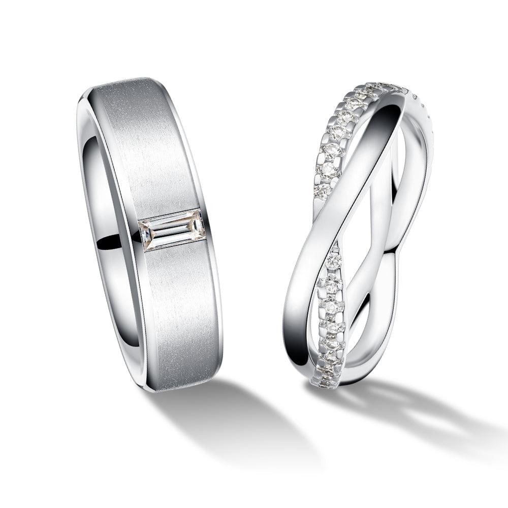 Satin Finish Emerald Cut and Infinity Moissanite Eternity Couple's Ring Set