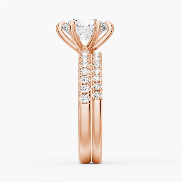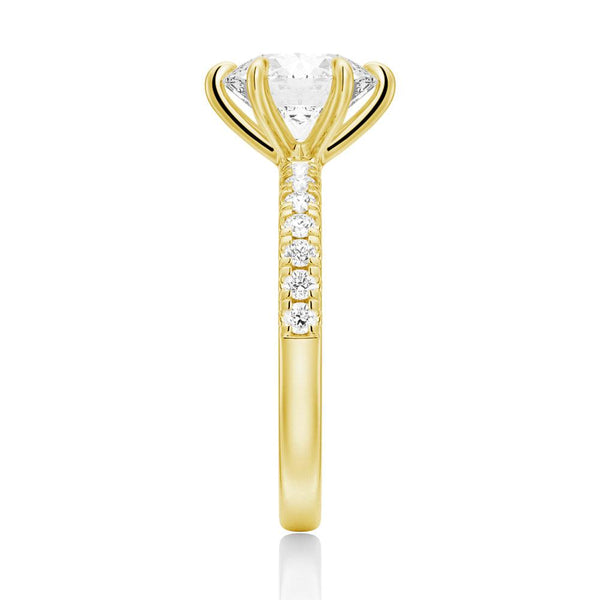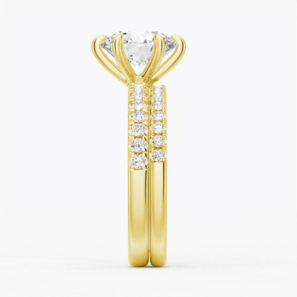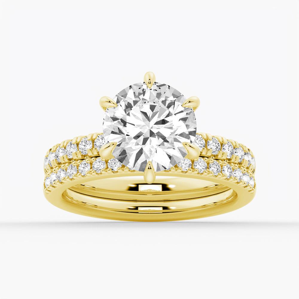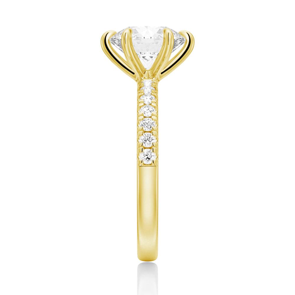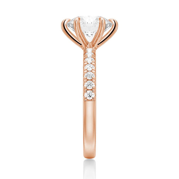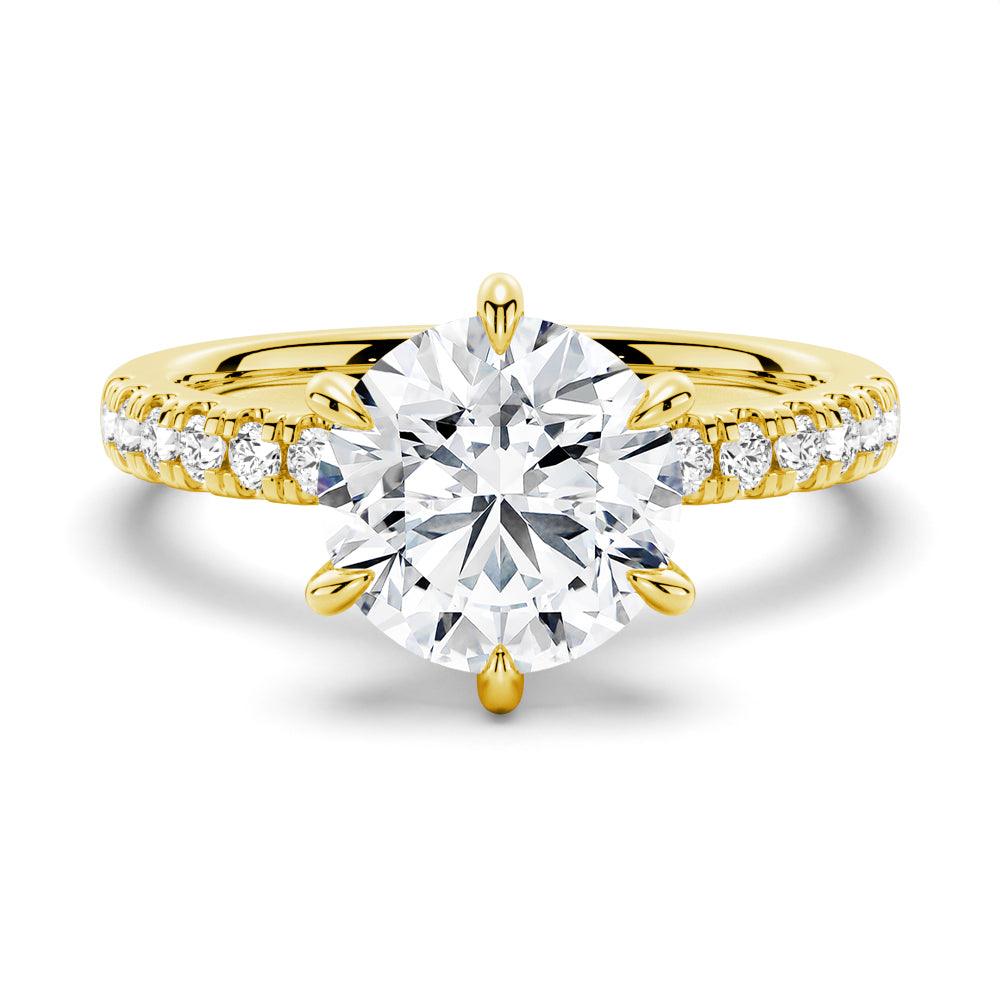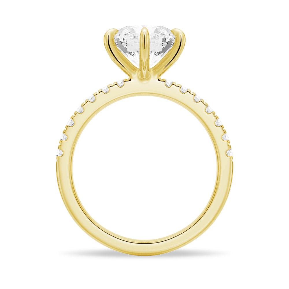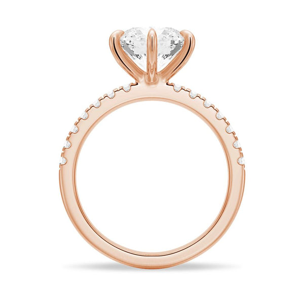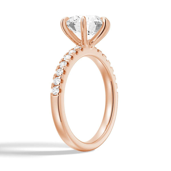This six-prong solitaire is the ultimate classic engagement ring style. Crafted to showcase your choice of diamond, petite six claw prongs secure and support the center stone. This engagement ring showcases French pavé-set diamonds set that complement your choice of the center diamond.