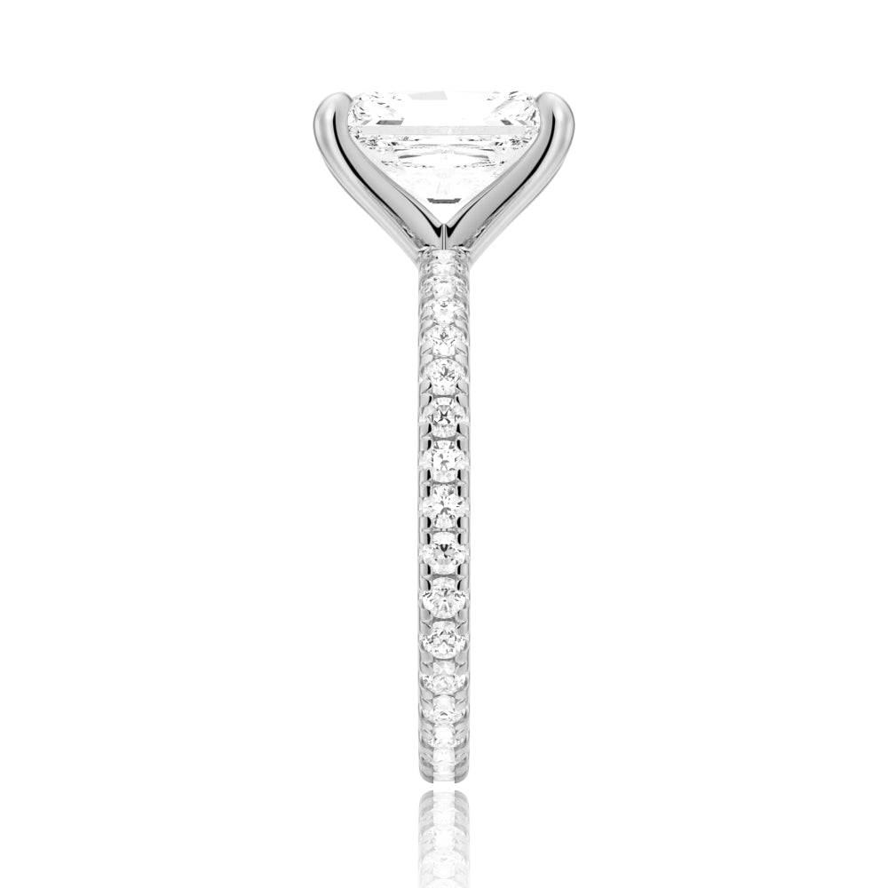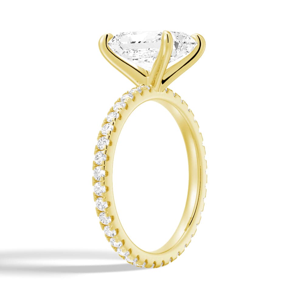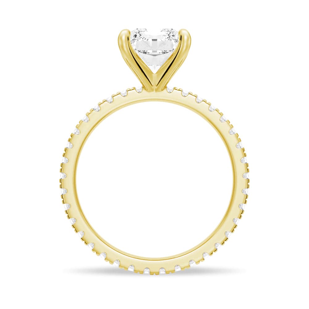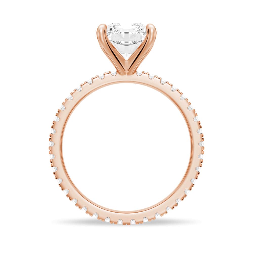 The center stone is delicately set on a sparkling eternity pave band, which adds an extra layer of brilliance and sophistication to the overall design. The pave setting ensures that the diamonds continue all around the band, symbolizing the unending love between two people.