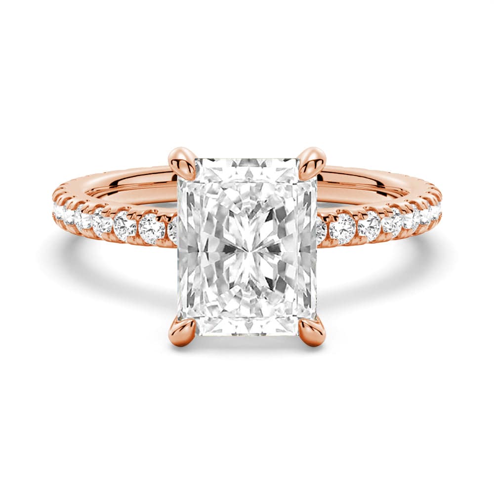Introducing our breathtaking Radiant Cut Moissanite Engagement Ring with Eternity Pave Band, a perfect representation of love and commitment. This stunning ring features a radiant cut moissanite center stone that's beautifully crafted to showcase its unique and captivating sparkle.