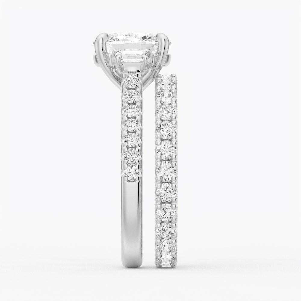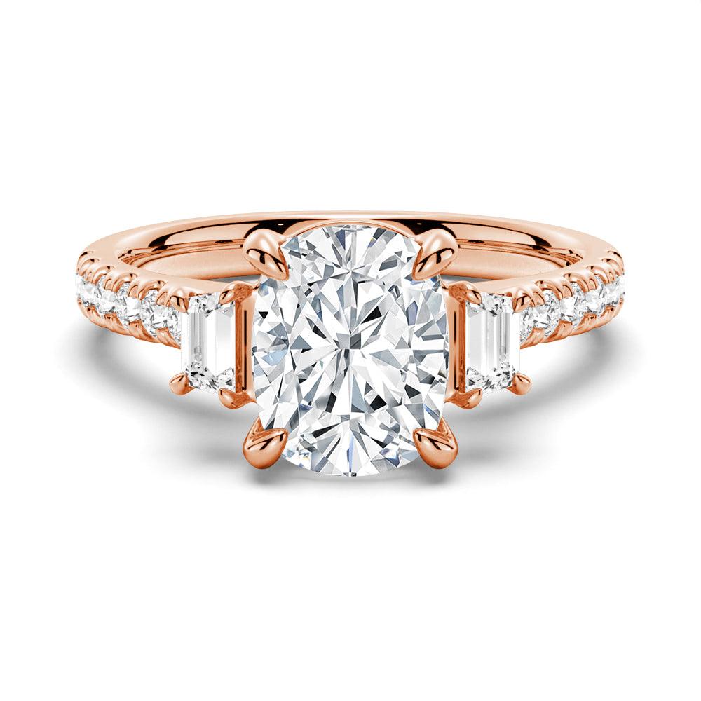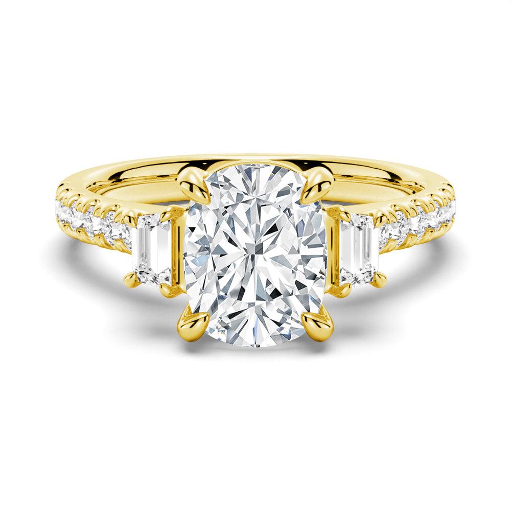 Three Stone Cushion & Half Moon Moissanite Engagement Ring with Pavé Band