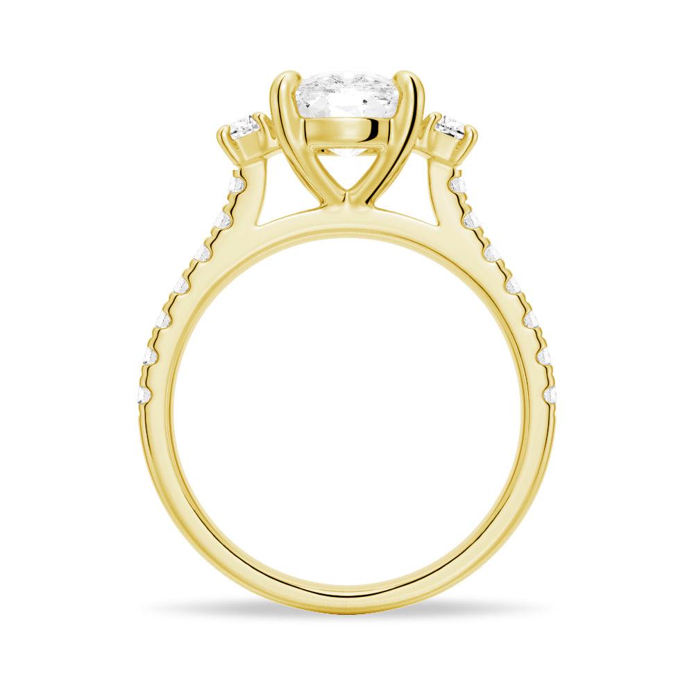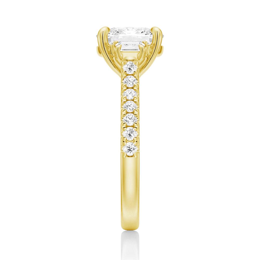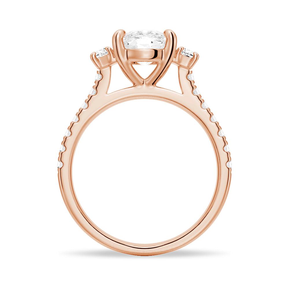 This moissanite engagement ring combines an elegant display of a cushion-cut center stone that sits beside two, gleaming half-moon cut side stones. Its striking composure is reinforced by the timeless design and appeal of the three-stone ring. Each stone represents a significant milestone in your life.