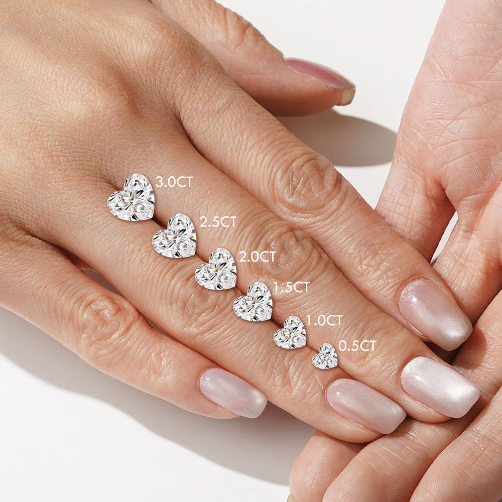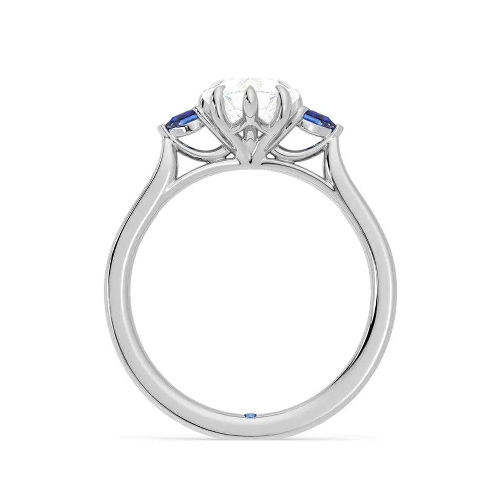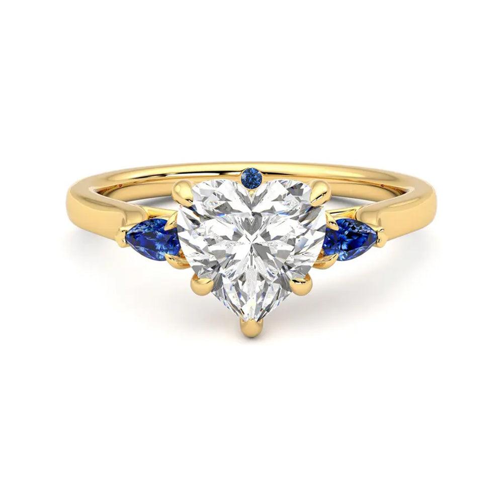 The central heart shaped moissanite takes center stage, flanked by two additional pear cut stones on each side, creating a harmonious and elegant arrangement that symbolizes your past, present, and future together.
