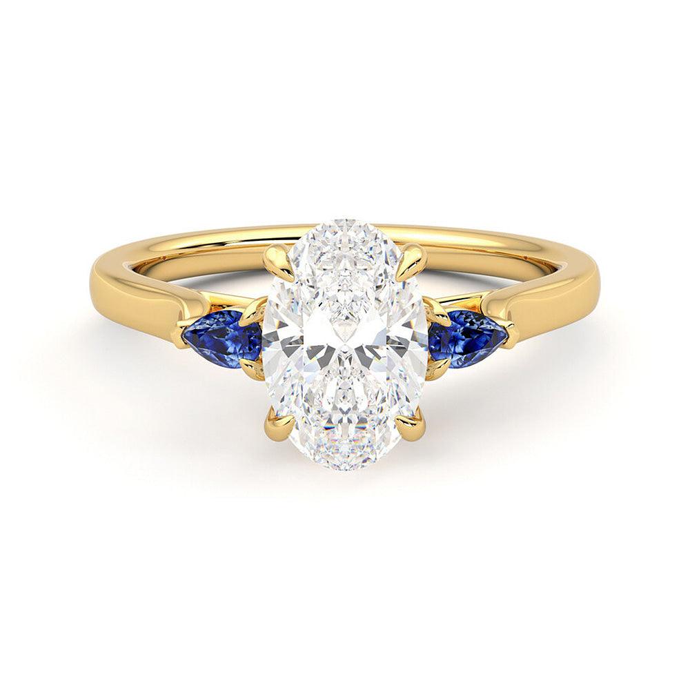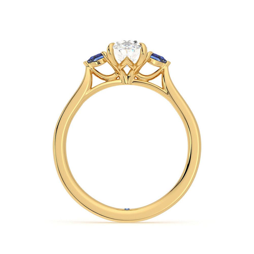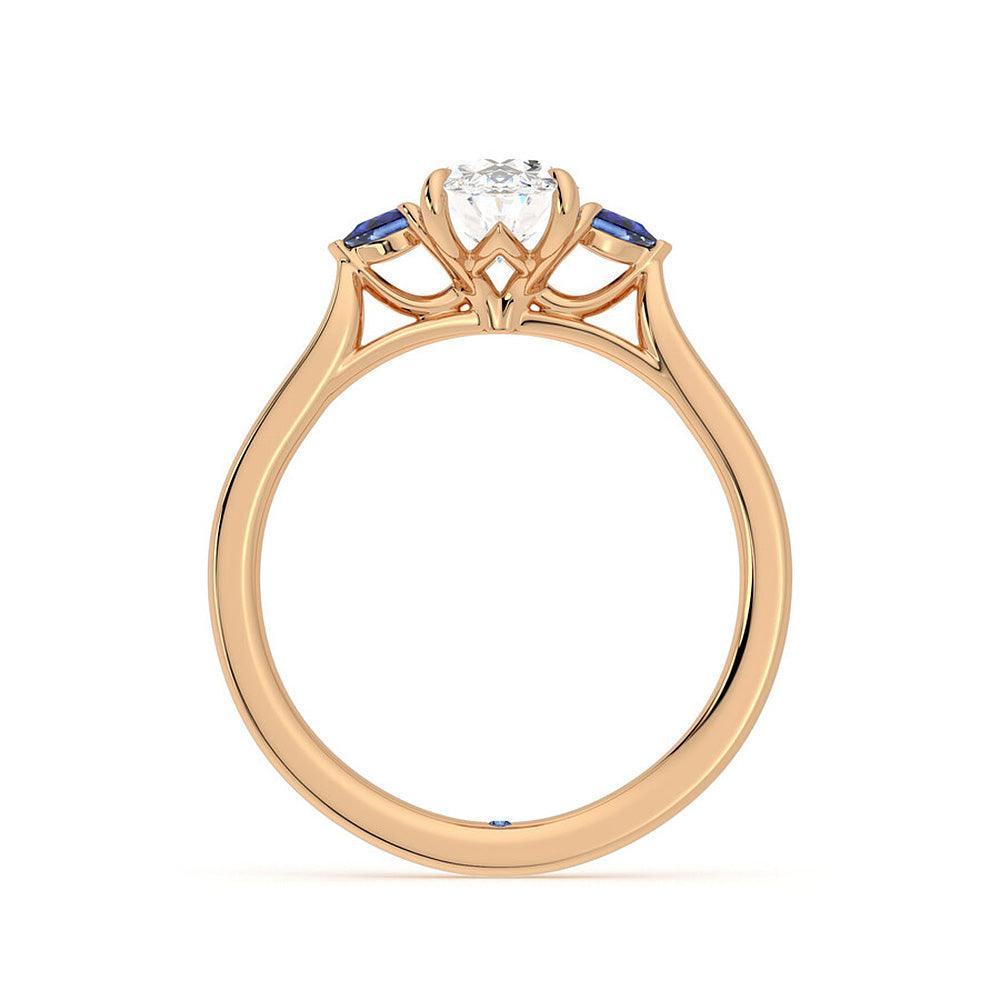 The central oval cut moissanite takes center stage, flanked by two additional pear cut stones on each side, creating a harmonious and elegant arrangement that symbolizes your past, present, and future together.