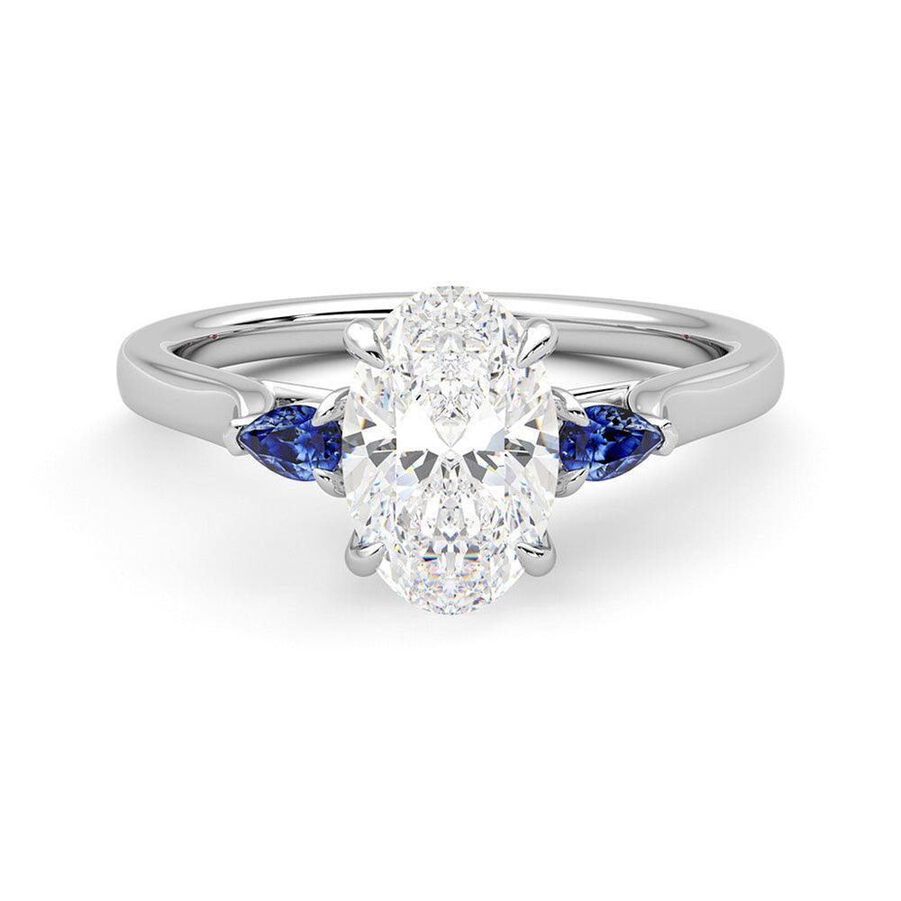 Three Stone Oval Cut Moissanite and Sapphire Engagement Ring with Hidden Anniversary Stone Accent